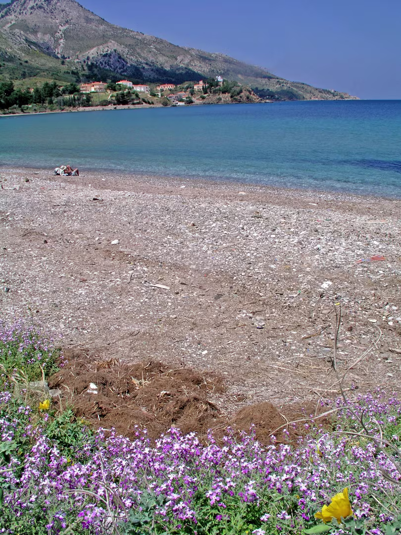 We klommen vanuit de Spilia accommodatie, die op 80 m hoogte ligt, verder 100 m omhoog en daalden af in het dal achter Spilia. We liepen dit dal geheel noordwaarts uit tot we bij de kust kwamen bij Naghos. Nadat we lekker een tijd op het strand gezeten hadden klommen we langs de kust weer omhoog en langs een windmolen omlaag naar de badplaats Marmora. Tot slot liepen we door de kambos (landbouwvelden) terug naar Spilia
