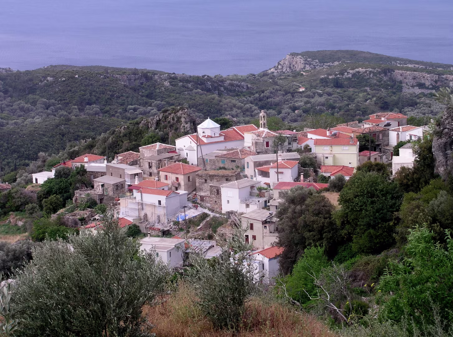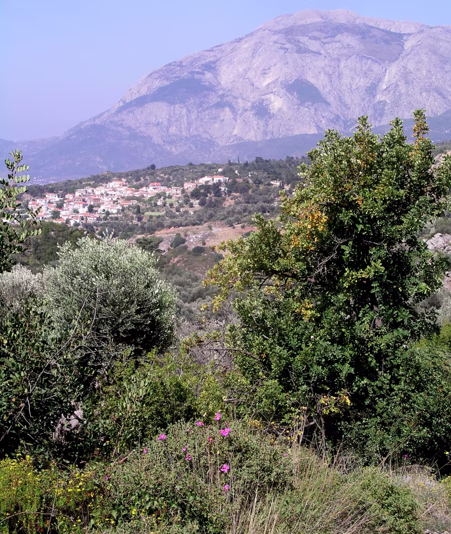 Onze taxi chauffeur zette ons af bij de taverne van Koutsi. Vandaar daalden we via Neochori en Koumeika naar de kust. Tot slot liepen we langs de kust naar ons hotel Kerkis Bay in Ormos Marathokampou.