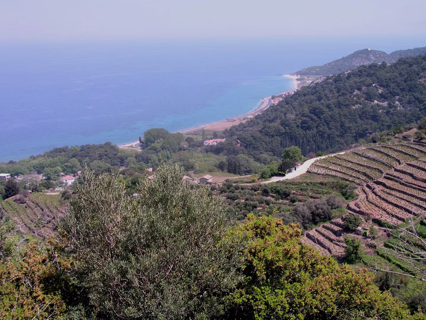 Op de eerste wandeldag 20 april 2007 werd er eerst vanuit hotel Iro in Platankia via Ayios Konstantinos naar het boven dorp Ano Ayios Konstantinos gelopen (rode spoor). Aan het einde van de middag liepen we vanuit hotel Iro in Platankia nog een rondje bij de ingang van de Nachtegalenvallei ten zuiden van het hotel (gele spoor)l.