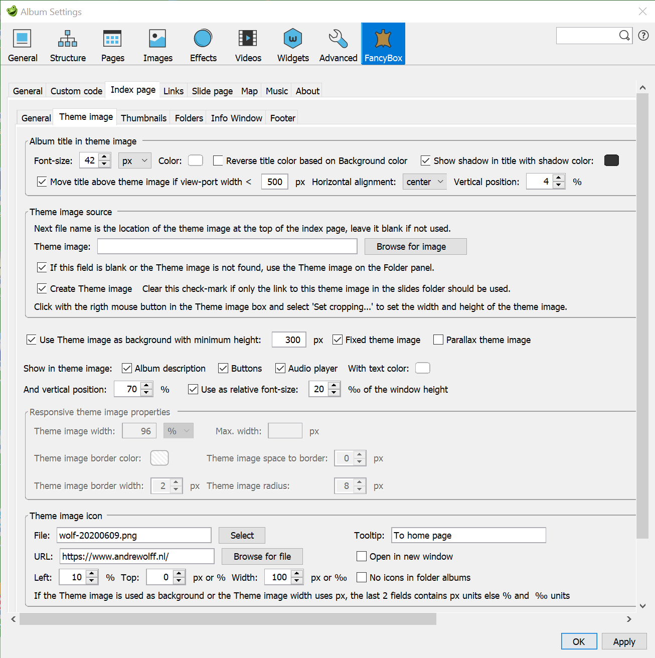 The Album title will be displayed as Title on the index page. After a change of the pictures path, click first the OK button and change next the Album Title and or the Album description otherwise these data are lost.
