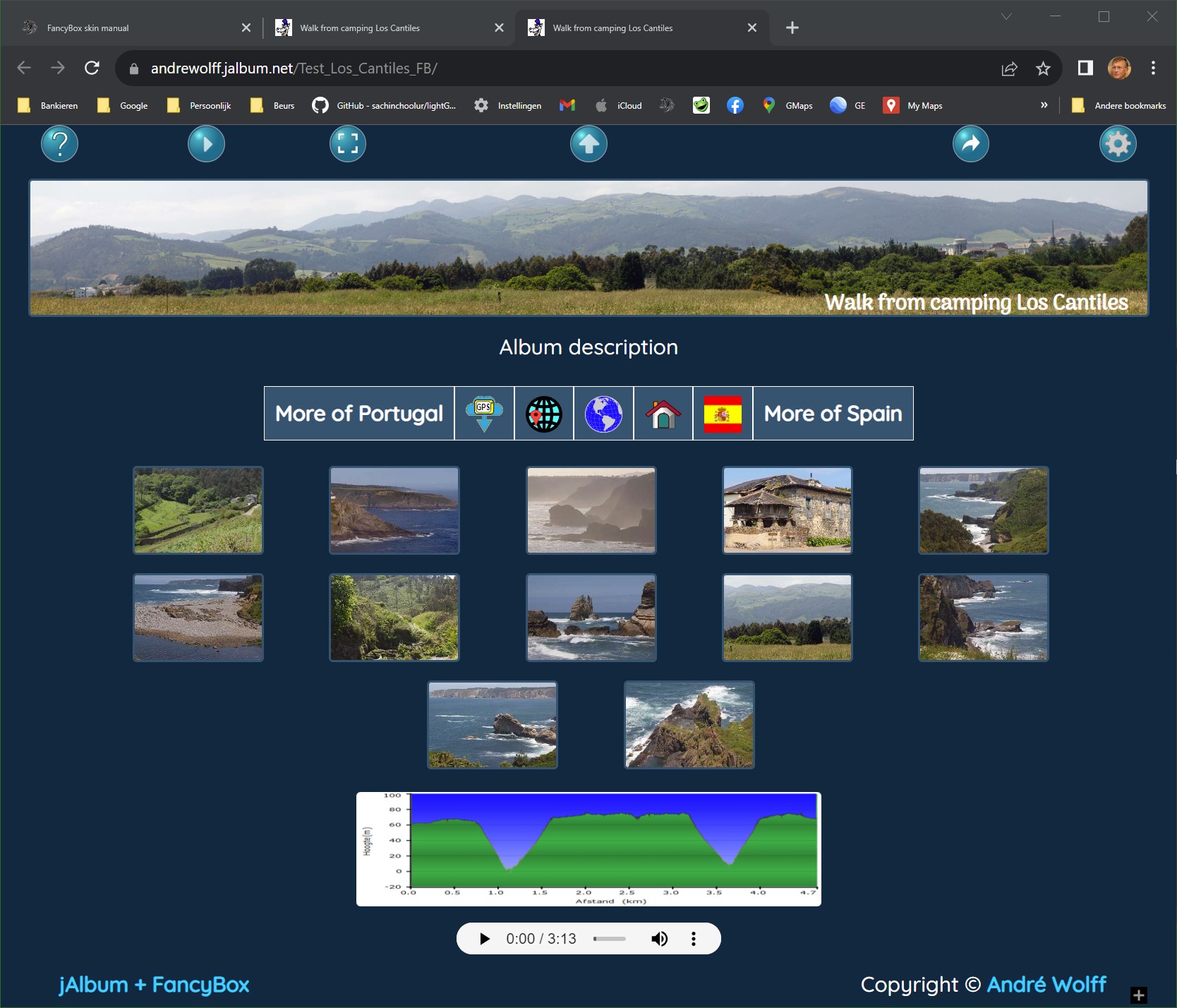 Next I opened the main Algarve album which produces 2560x1440 images with file Algarve.jap in the images directory, changed the slide image bounds to 812x375 (iPhoneXR screen size) and I changed the output directory to the just created folder Algarve_S. That is mostly sufficient, but I changed a number of more things: I removed the Google Translate link and changed some back links to my Algarve site to use spatial page I made there for small mobile devices..