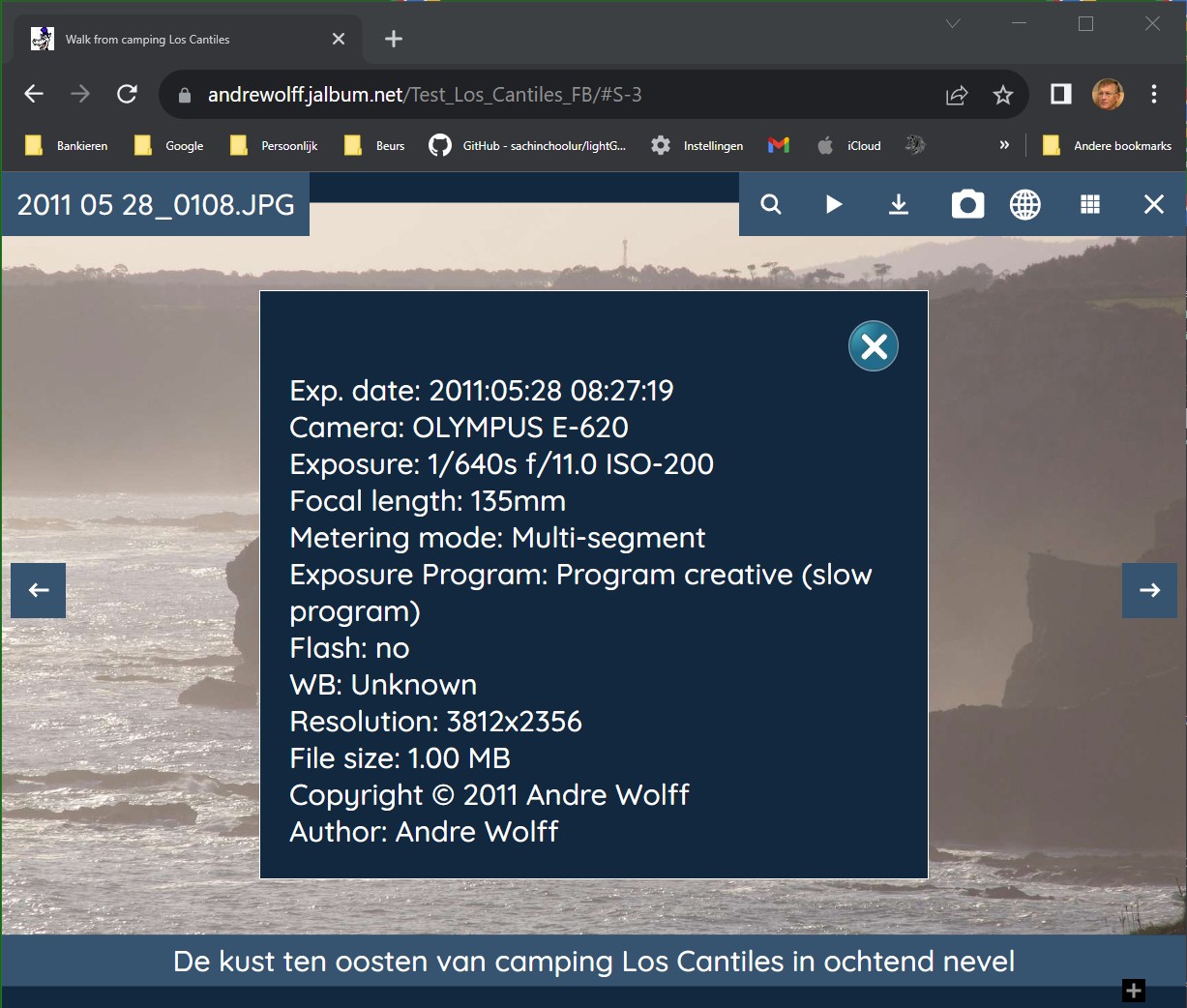 If you click the Show Exif data buttonor on a PC by clicking the E-key, the camera data are displayed in a modal window:
