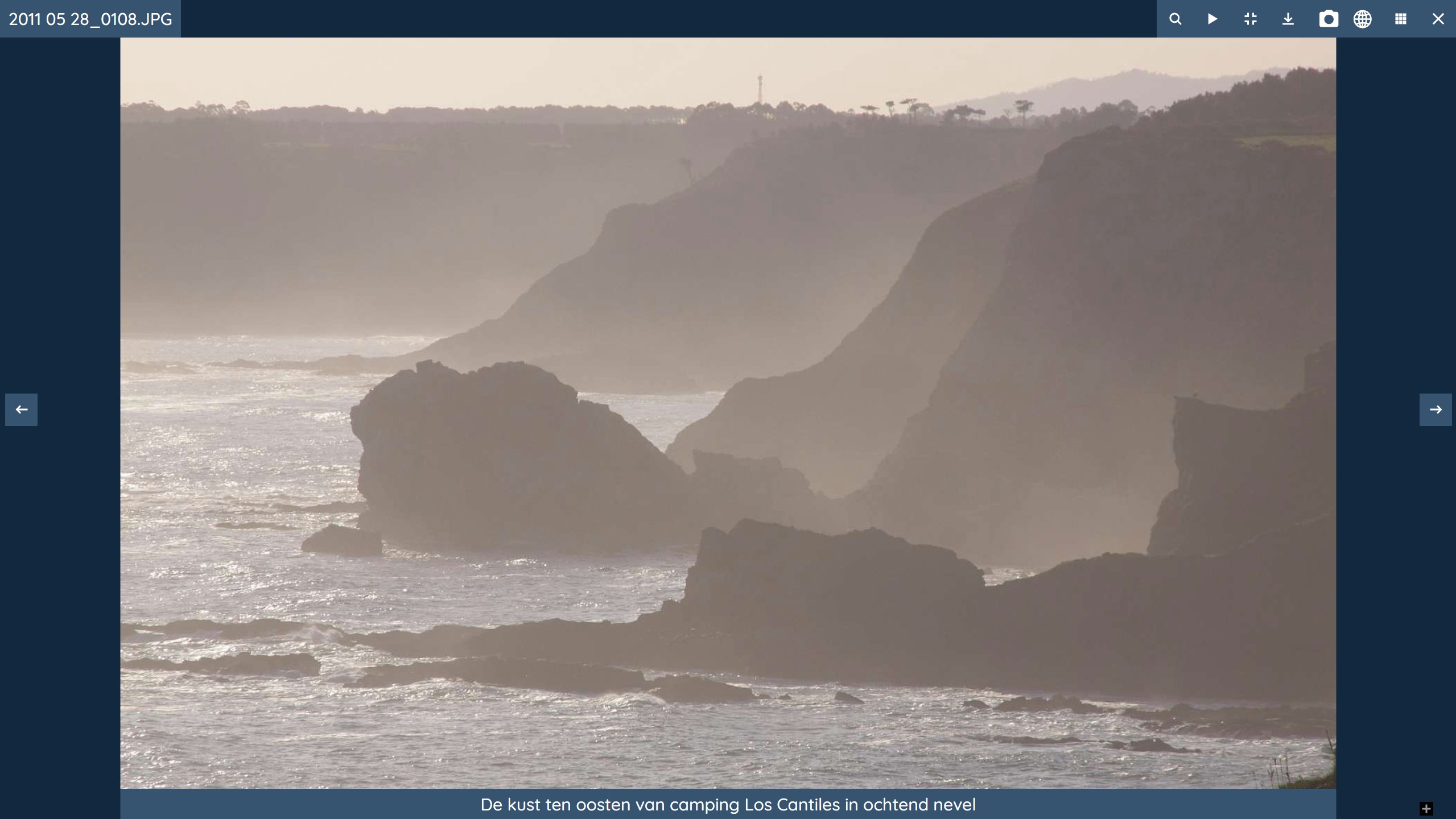 In this example the buttons have a transparency of 0%. It is also possible to hide the buttons on a slide page (always or show the buttons only in the pause state) and do the navigation via swipes or fast keys. The functions of the buttonsin the upper right corner are: Zoom image, Start slide-show, Leave full screen mode, Download image, Show Exif camera data, Show location, Show thumbnails below the slide image and close light-box and return to the index page.