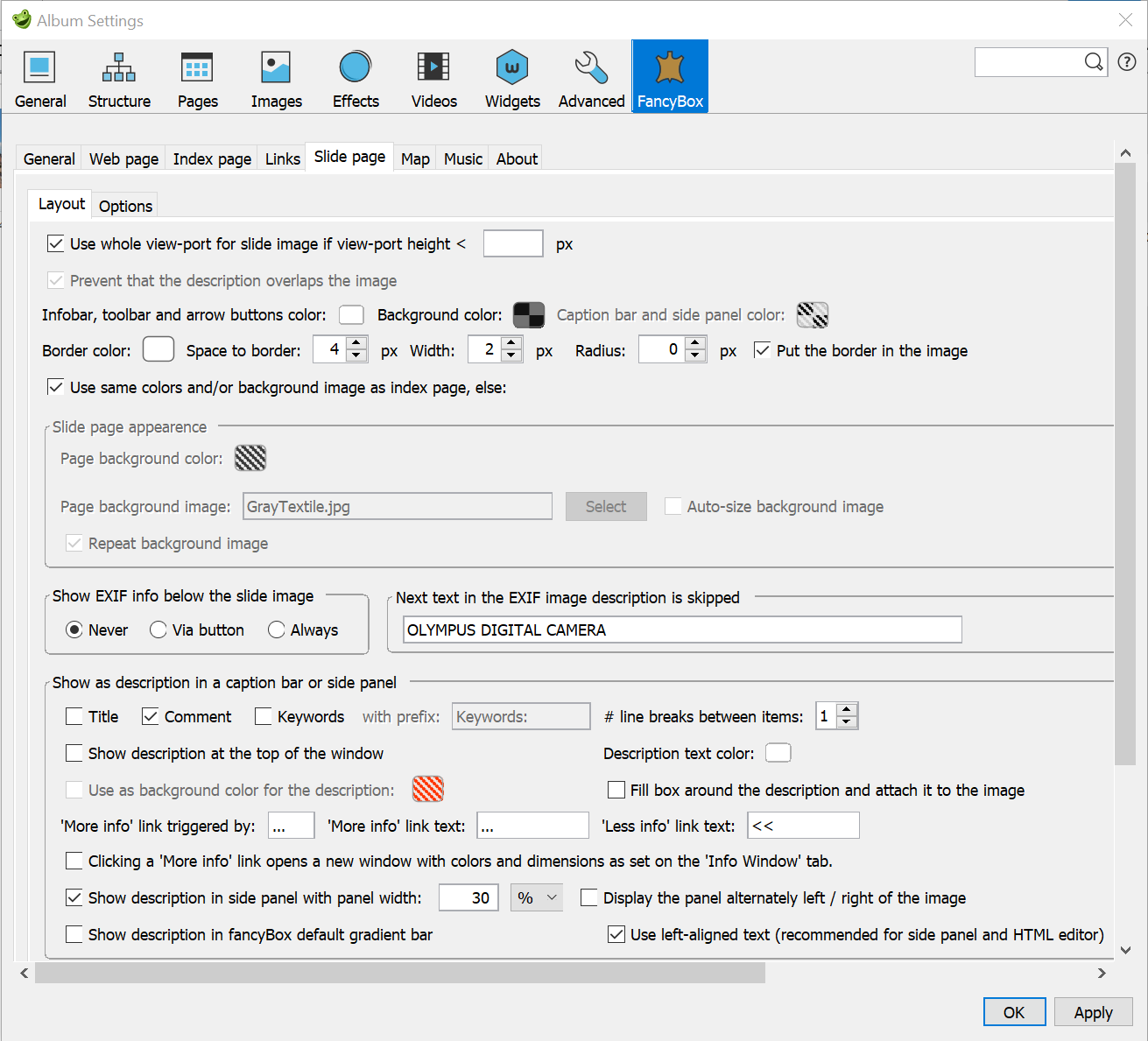 You should select here check-marks 'EXIF Image Desc.' and 'Include photographic data in generated pages' to add descriptions to slides and GPS data to identify the location of the picture. In jAlbum version 14 it is also required to set the xmp check-mark, otherwise special characters like é and © are not correctly displayed.
