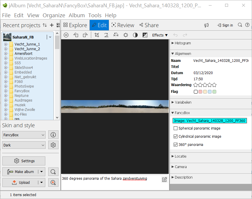If you set the 'Spherical panoramic image' check-box the panorama will be displayed in the interactive Photo Sphere Viewer created by Jérémy Heleine, if the 'Use Spherical Panorama Viewer' check-mark on the Skin settings – Slide page / Options is set. Click here to see an album made with spherical panoramic pictures. You should only do this if it is horizontally a 360° panorama. In the ideal case the panorama should vertically span an angular range of 180°, so in that case you have an aspect ratio of 2:1. Special 360° cameras, like the Ricoh Theta V, create these images exactly, see the first 3 panorama pictures in the example album.