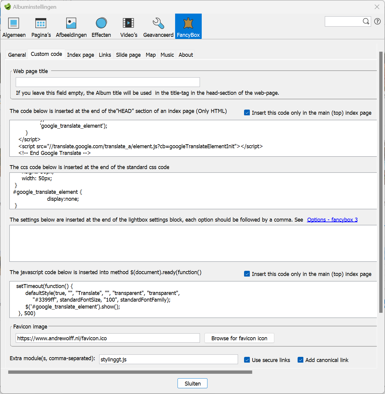 Next I opened the main album again, added the code given above in the HEAD field of the Web page tab and made and uploaded the main album.