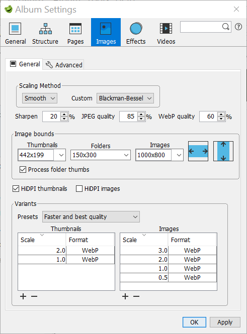 You see in the screen-shot of the jAlbum Images General tab above 5 variants selected, by selecting in the combo-box 'Faster and best quality'.