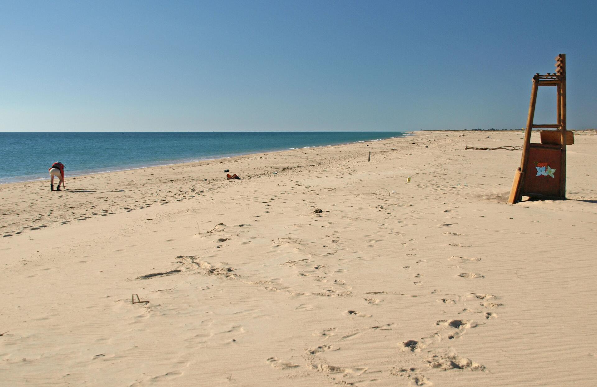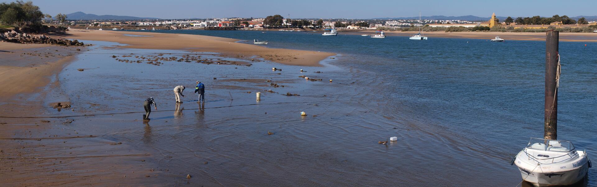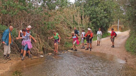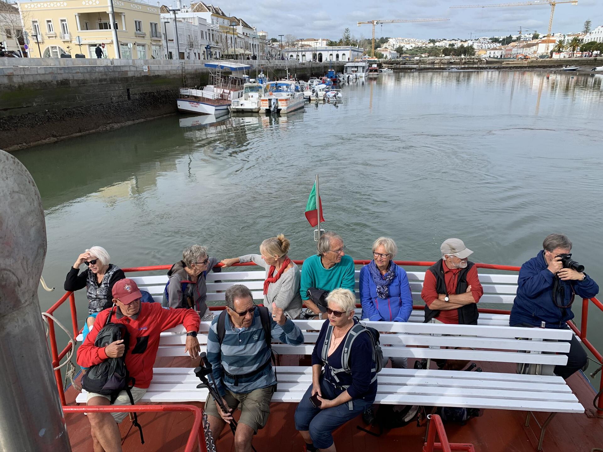 Vanuit het station van Porta Nova loop je naar beneden naar de oude mercado. Sinds 2023 vertrekt de boot om 09:30 en 10:40 achter de oude Mercado, na de fiets/voetgangersbrug over de rivier. Het pontje brengt je in 40 minuten naar de het eiland. Volg het pad door de duinen naar het strand. In januari is daar maar één restaurant open en daar worden schandalig hoge prijzen berekend. Loop ruim een uur langs het verlaten strand totdat je op een ankerkerkhof stuit. Je gaat daar rechtsaf. Achter het anker kerkhof is een voormalige legerplaats omgebouwd tot restaurant, waar U tegen redelijke prijzen wat kunt eten en drinken. Loop langs het smalspoor naar de pontonbrug naar het dorpje Pedras del Rei. Je kunt natuurlijk ook het treinje naar de pontonbrug nemen. Loop over de pontonbrug rechtdoor het bungalowpark in en ga na het park rechtsaf waar een bord naar Quitamar verwijst. In de verte zie je Tavira liggen. Je loopt met aan je linkerhand sinaasappel- en citroenbomen en aan de rechterkant een druivenwijngaard tot een driesprong. Neem daar de rechterpoot naar Quitamar. Je volgt nu alsmaar de holleweg; dit zou een oude Romeinse weg zijn. Let op de enorme cactus voor huisnr. 220a (geelwit huis). Bij 2 roodwitte paaltjes rechts aanhouden en de eerstvolgende afslag naar rechts negeren. Aan je linkerhand een gele muur met draad en dan tenslotte ook links een honderd meter lange stenen muur die overgaat in draadhekken rond een scholencomplex. Loop langs dit hek en houd links aan om via de rua Luis de Camoes het station van Tavira weer te bereiken. Deze variant, het blauwe spoor, is 17km lang.
