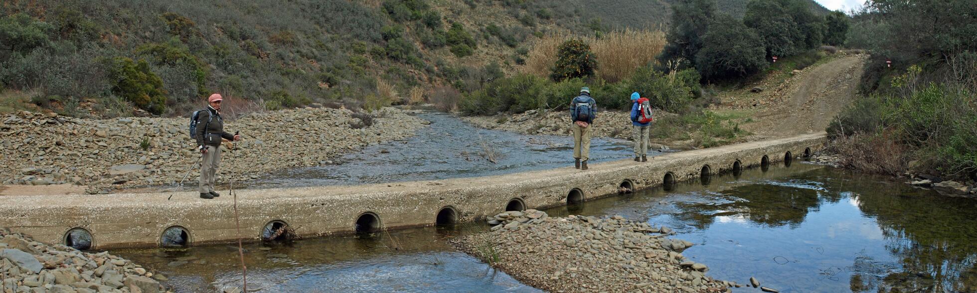 Wij waren van plan om wandeling 20 uit het boekje '22 wandelingen door de Algarve' te gaan lopen. Deze wandeling heeft als begin en eindpunt het dorpje Cortelha de Baxio ten zuiden van Cachopo, maar je kunt daar met een normale auto niet komen (althans in 2009). Wij zijn daarom gestart bij de brug over de Odeleite rivier bij Portela aan de N397. Dit is echter een lange aanloop route; wij zijn daarom eerder teruggekeerd, ook omdat we de route uit het boekje niet konden vinden. Later heb ik in Google Earth wel de juiste route uitgezet (denk ik). Die route van 12km kunt U vinden in de GPS tracklog file. U kunt met de auto iets dichterbij komen door bij Portella linksaf over de brug te gaan en door te rijden naar het einde van de asfalt weg.