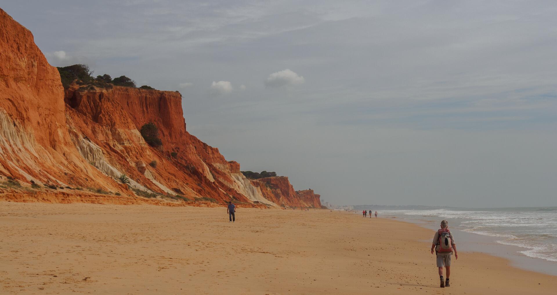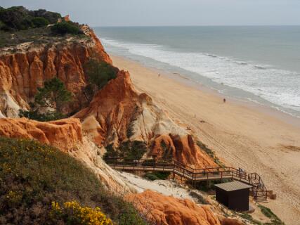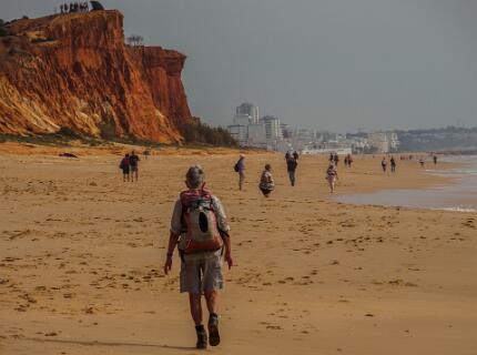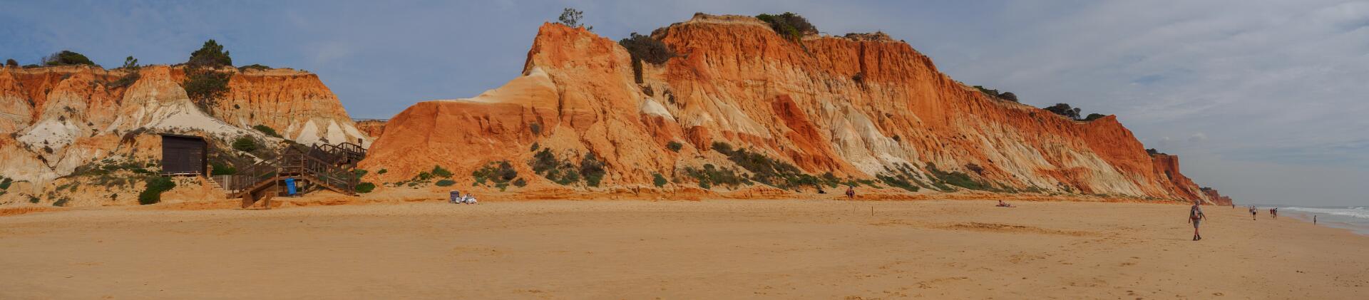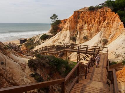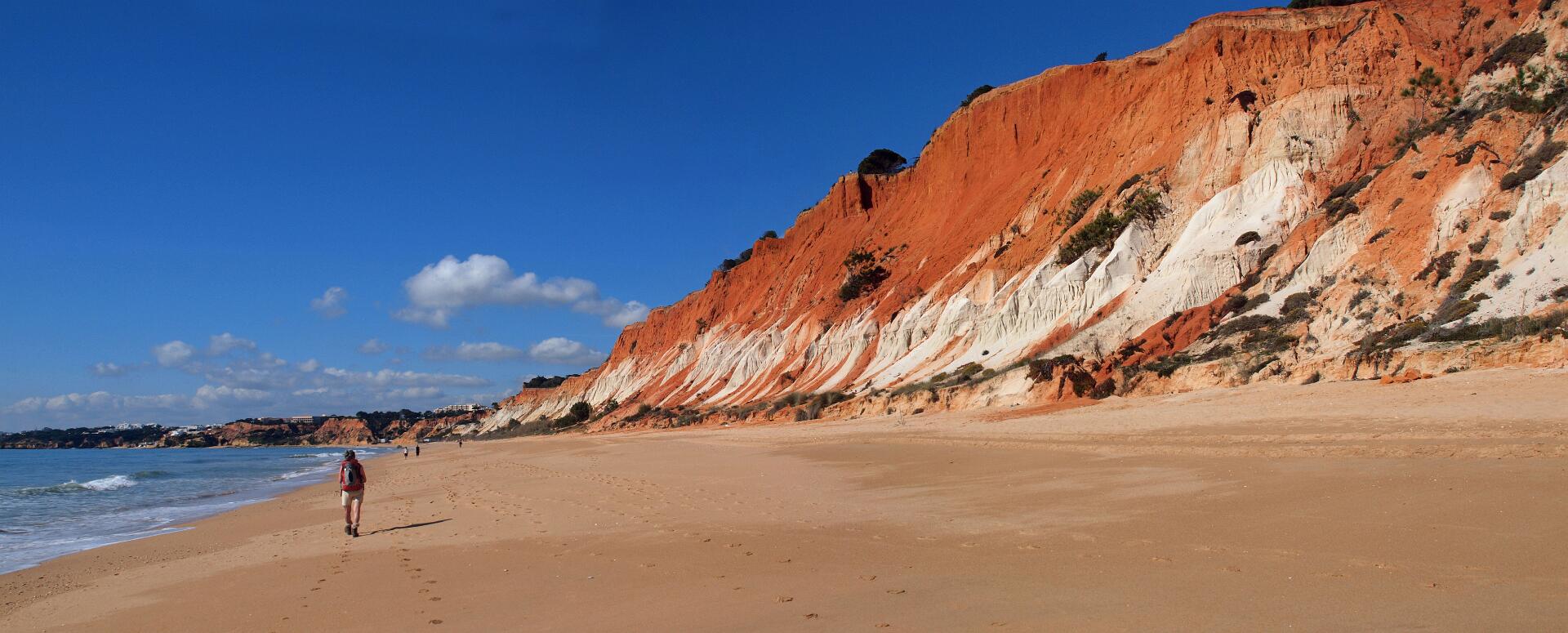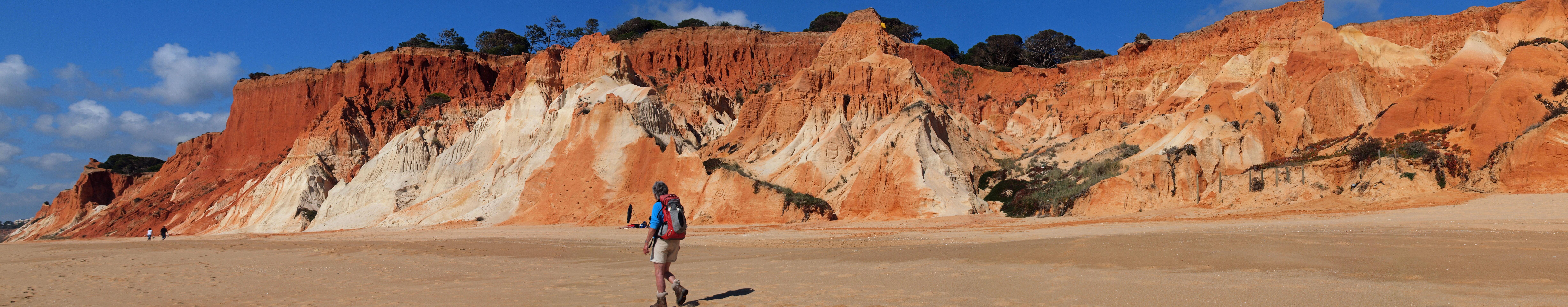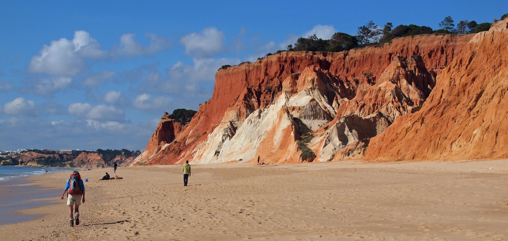 In 2011 liepen we vanaf het station van Boliqueime lnaar Alfamar en daarna over het strand naar Olhos de Agua. Dit is wandeling 16 uit de Rother Wanderfürer van Algarve. Daarna wilden we volgens wandeling 15 doorlopen naar Albufeira, maar dat kan helemaal niet als het niet volledig eb is. Hoger over de kust lopen is geen optie, want dat staat vol met resorts. We namen een taxi naar het station van Albufeira dat 6 km uit de kust ligt. Totaal 21km, rode spoor. In 2017 liepen we weer vanaf het station van Boliqueime naar Praia de Falesia en vandaar via het strand naar Quarteira waar we met de bus terugreden naar Faro. Totaal 15km, groene spoor en foto 15 en volgende.