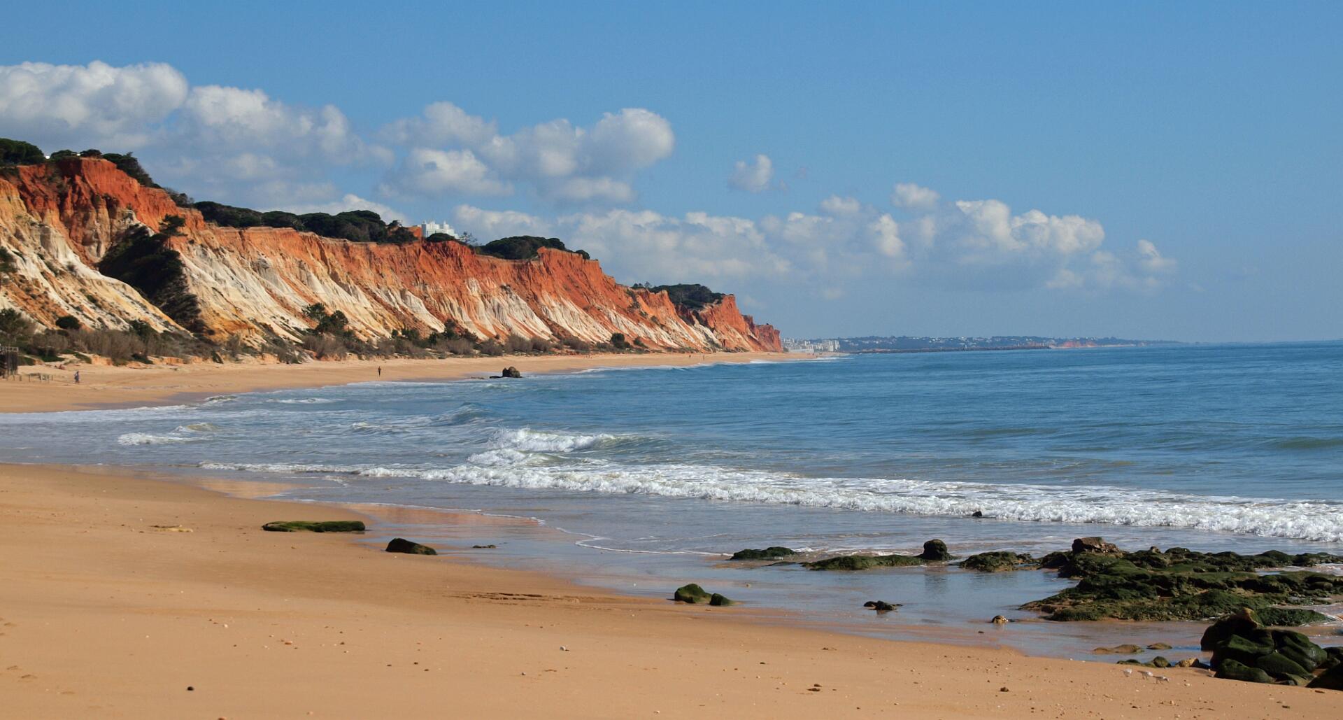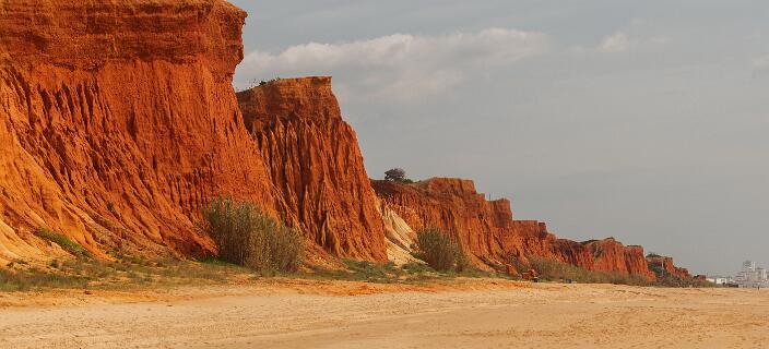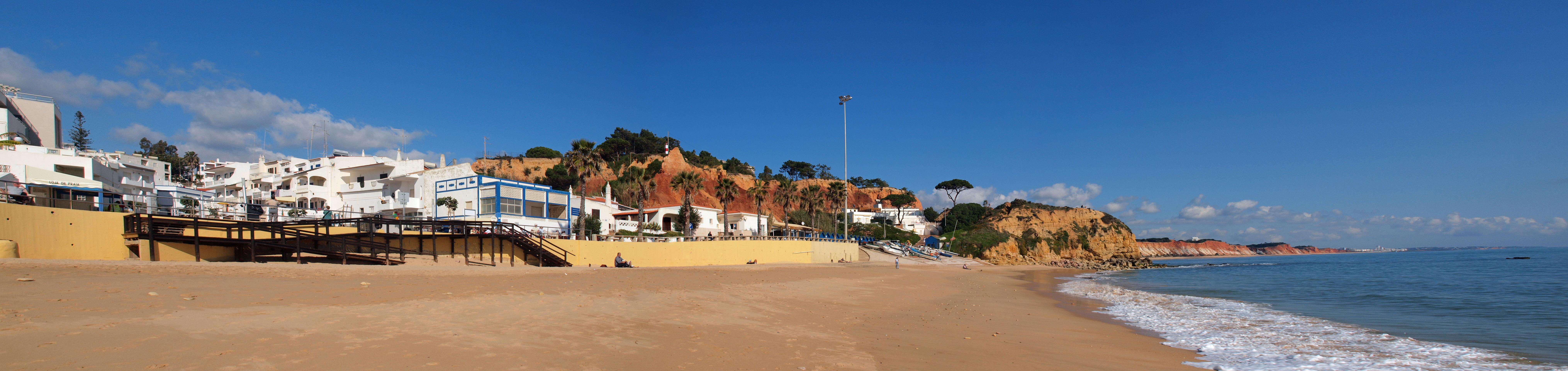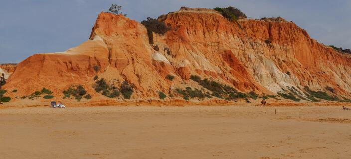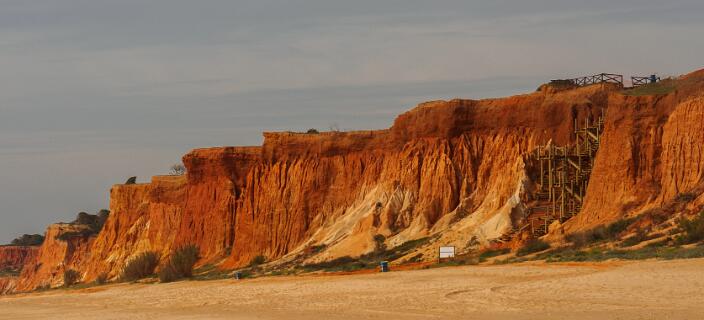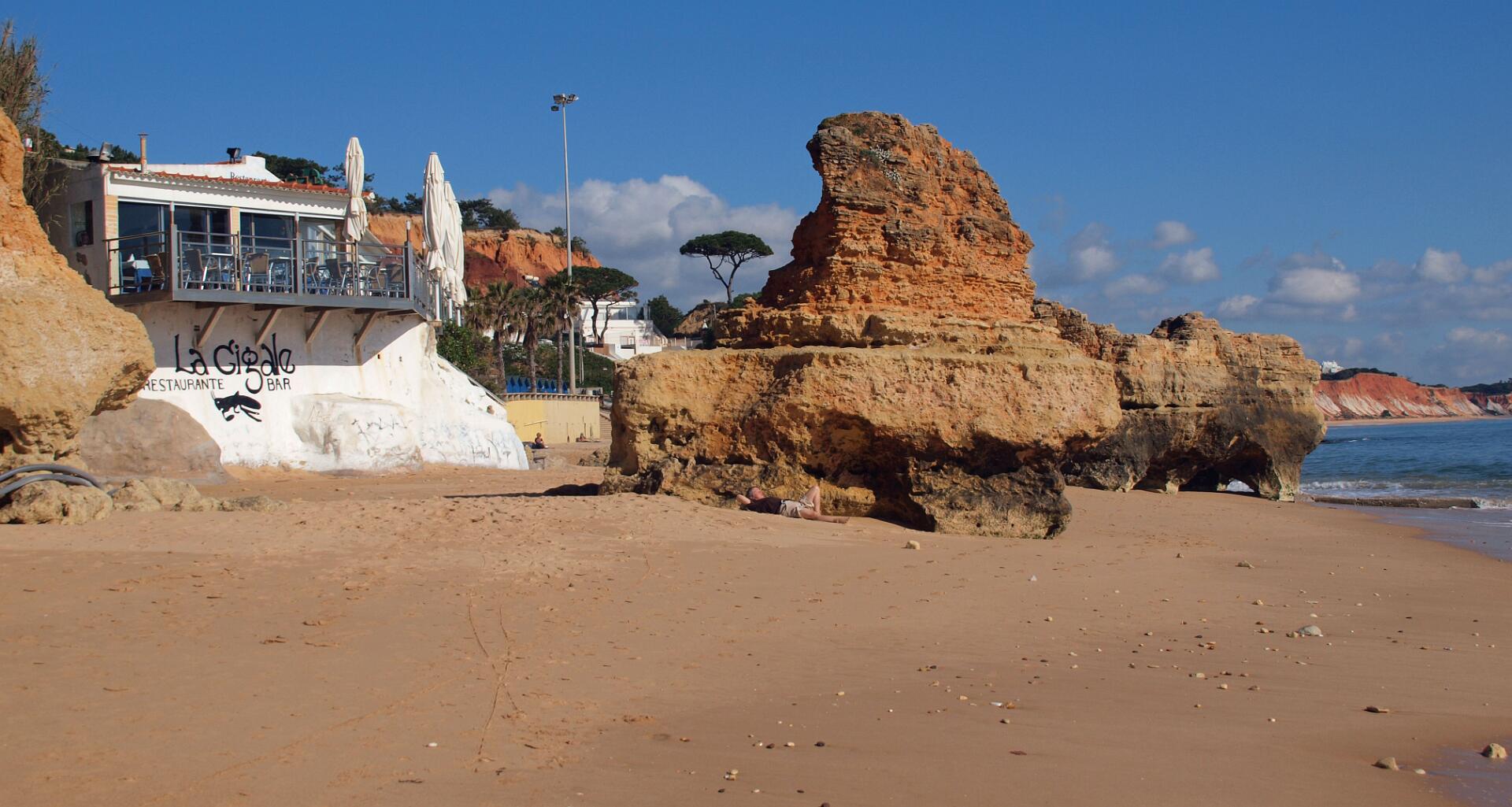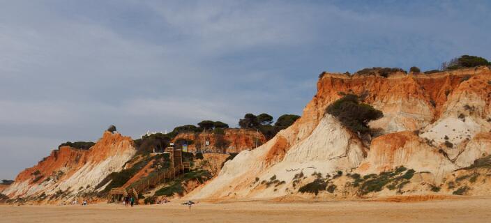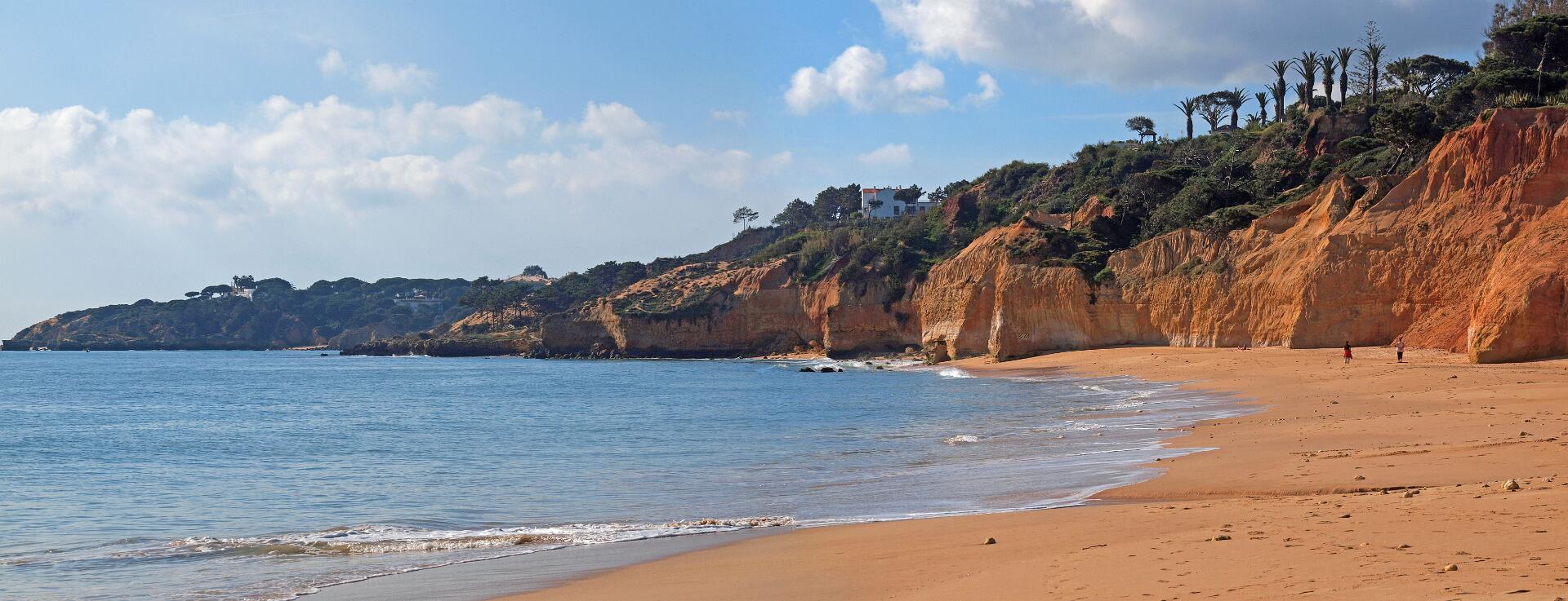 In 2011 liepen we vanaf het station van Boliqueime lnaar Alfamar en daarna over het strand naar Olhos de Agua. Dit is wandeling 16 uit de Rother Wanderfürer van Algarve. Daarna wilden we volgens wandeling 15 doorlopen naar Albufeira, maar dat kan helemaal niet als het niet volledig eb is. Hoger over de kust lopen is geen optie, want dat staat vol met resorts. We namen een taxi naar het station van Albufeira dat 6 km uit de kust ligt. Totaal 21km, rode spoor. In 2017 liepen we weer vanaf het station van Boliqueime naar Praia de Falesia en vandaar via het strand naar Quarteira waar we met de bus terugreden naar Faro. Totaal 15km, groene spoor en foto 15 en volgende.