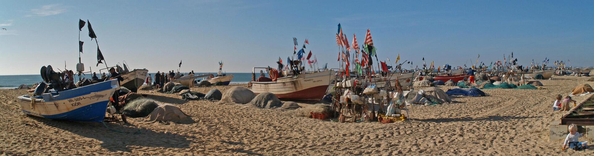 De boten van de vissers in Monte Gordo worden na het vissen het strand opgetrokken. Vanaf het terras van de strandtent Jaime had men een goed overzicht van de activiteiten van de vissers (Jaime is gesloopt bij de renovatie in 2017).