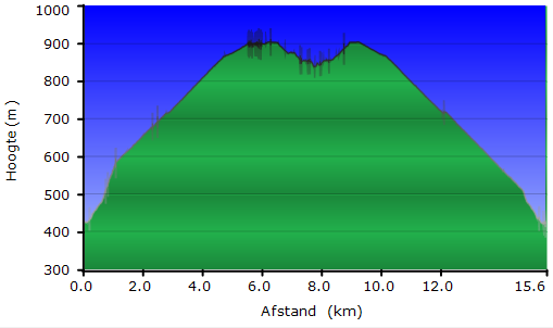 We liepen via een pad achter de camping naar de D16 en volgden daarna de D16 totdat we op de hoogvlakte, de Causse Méjean, aankwamen. Heen en terug 16 km waarbij er 618 m gestegen en gedaald moest worden.