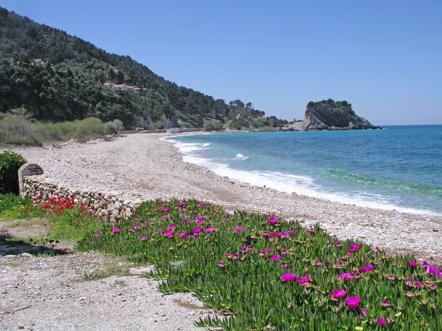 We liepen vanuit hotel Astir in Karlovasi in westelijke richting naar het dorpje Oud-Karlovasi. Daarna gingen we verder omhoog naar het klooster Agh. Loannou en door een vallei langs een geiten farm naar de kust. We daalden even af naar het Potami strand en klommen vervolgens weer omhoog om de kerk van Oud-Karlovasi te bezoeken. Tot slot daalden we weer af naar ons hotel.