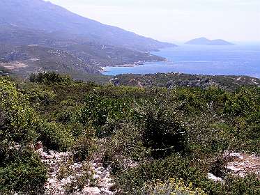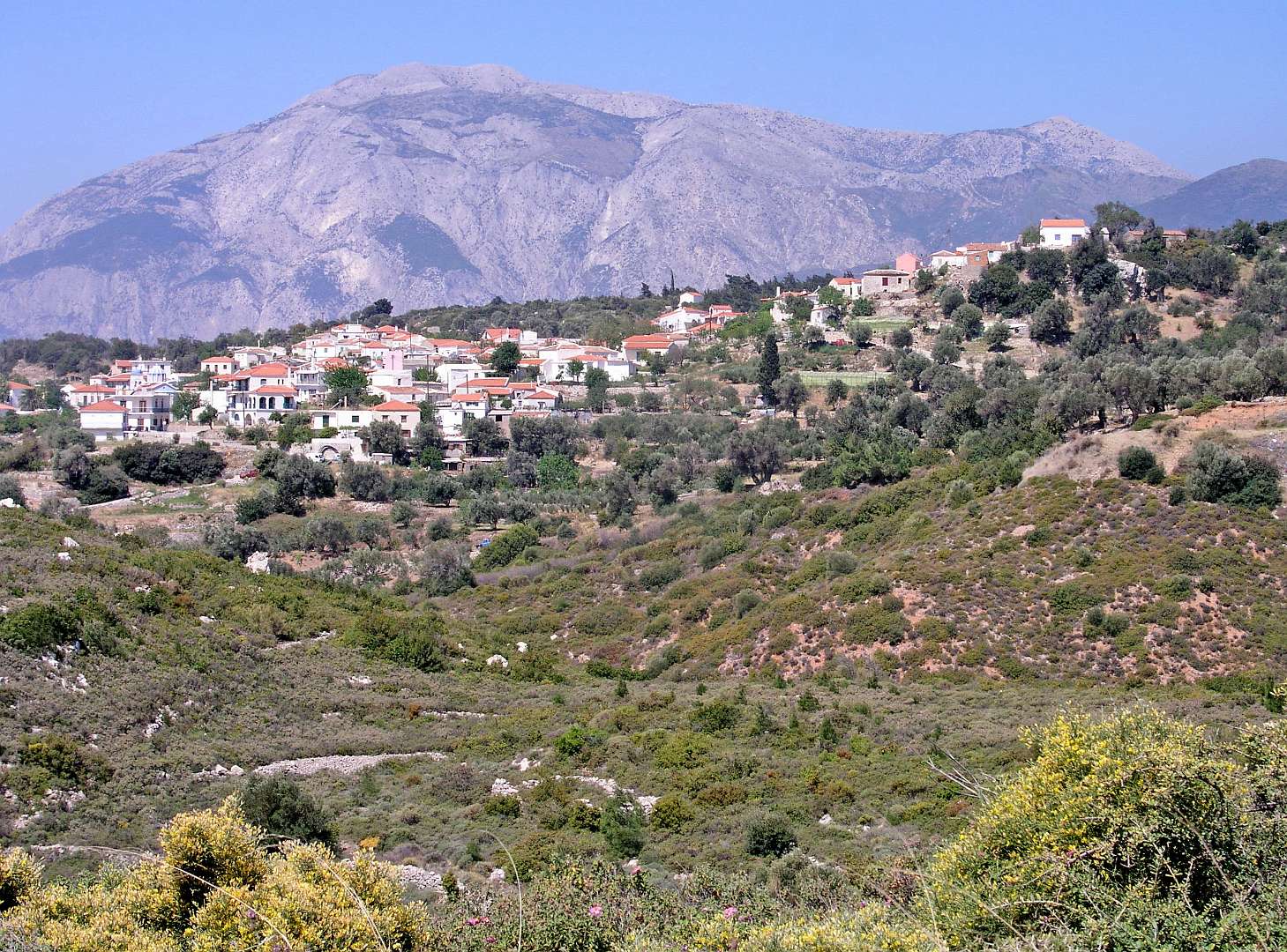 Onze taxi chauffeur zette ons af bij de taverne van Koutsi. Vandaar daalden we via Neochori en Koumeika naar de kust. Tot slot liepen we langs de kust naar ons hotel Kerkis Bay in Ormos Marathokampou.