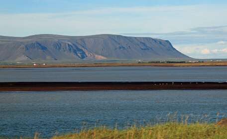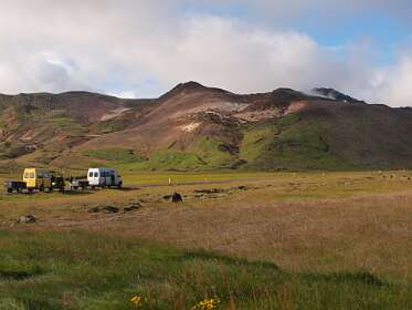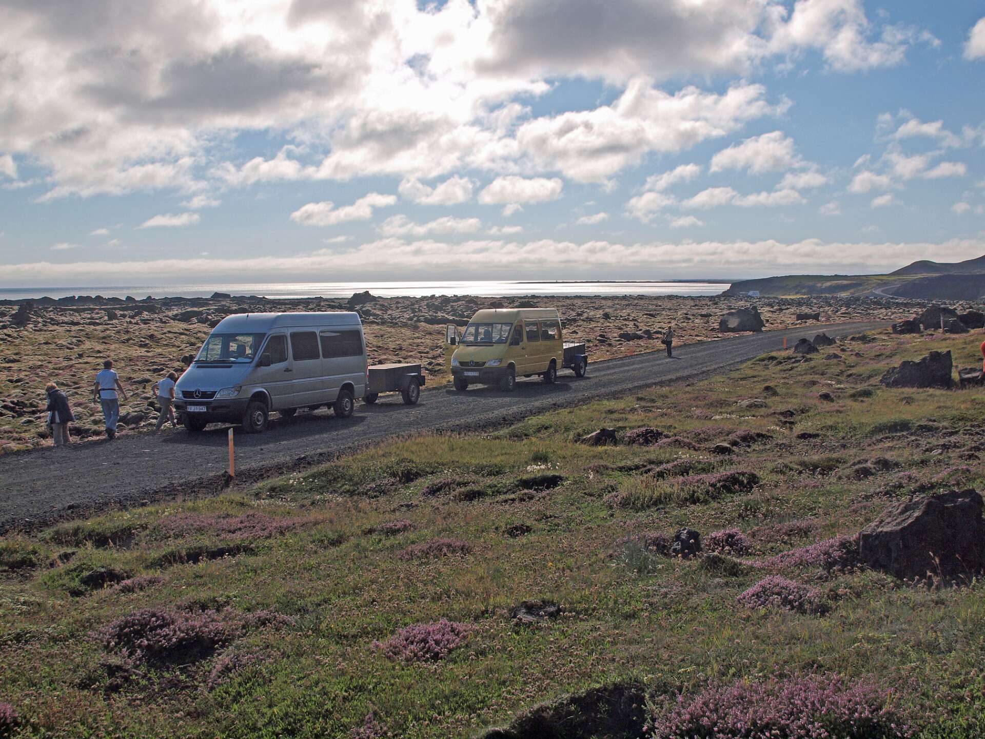 Na de landing op de internationale luchthaven van Keflavik werden we verwelkomd door Pierre, onze gids/chauffeur. In 2 Mercedes busjes met aanhangers reden we via de zuidelijke kust van het schiereiland Reykjanes naar onze eerste overnachtingsplaats, de voormalige school Gaulverjaskoli, ten zuiden van Selfoss.