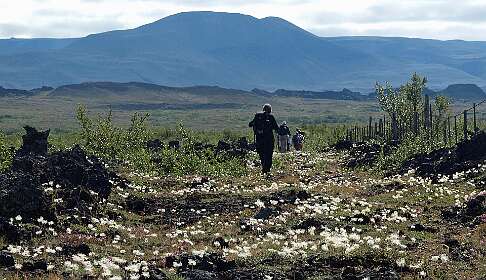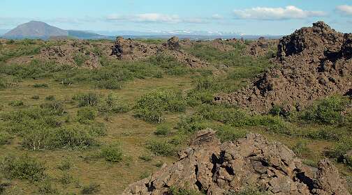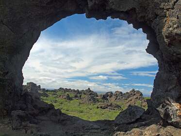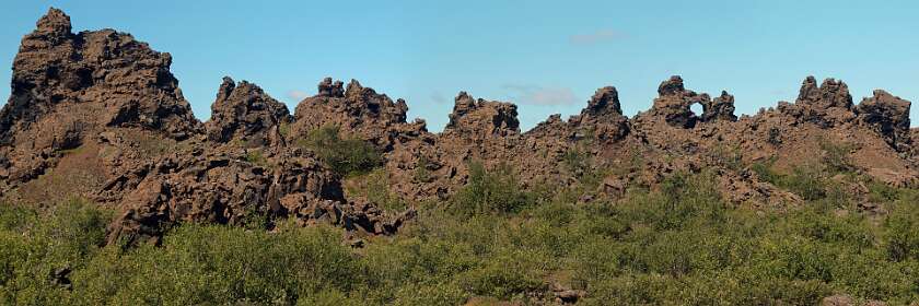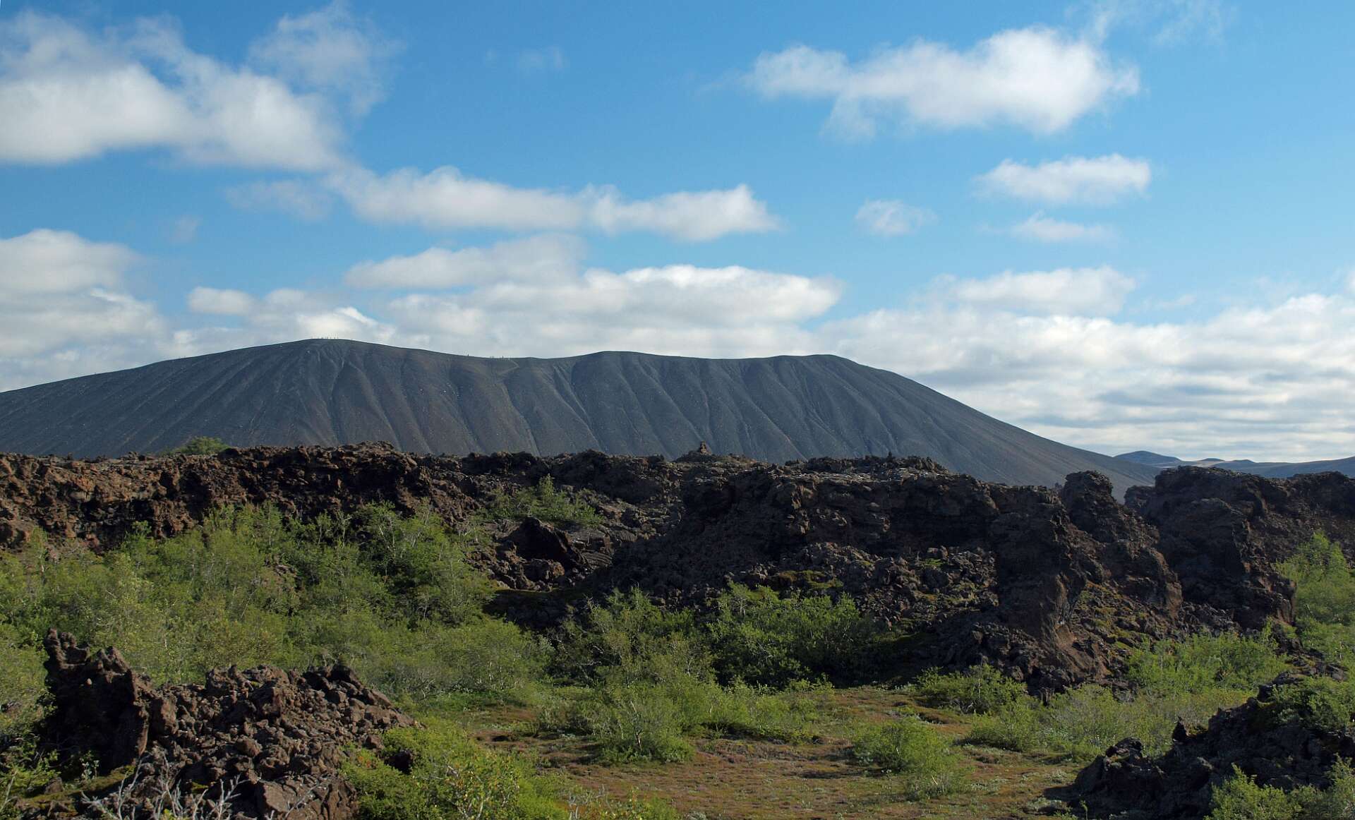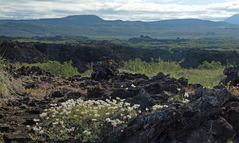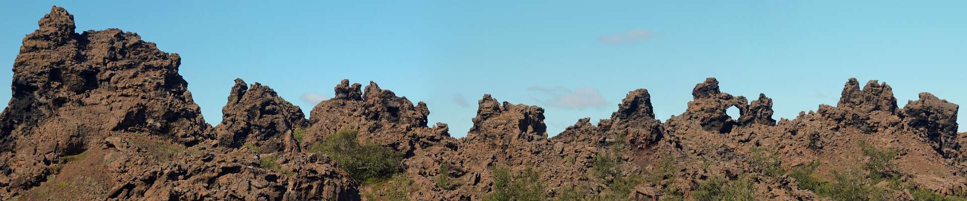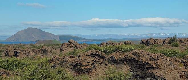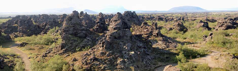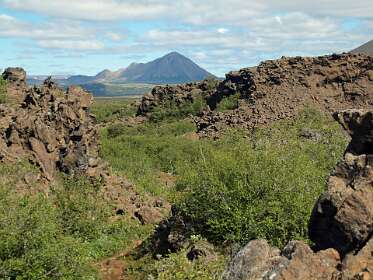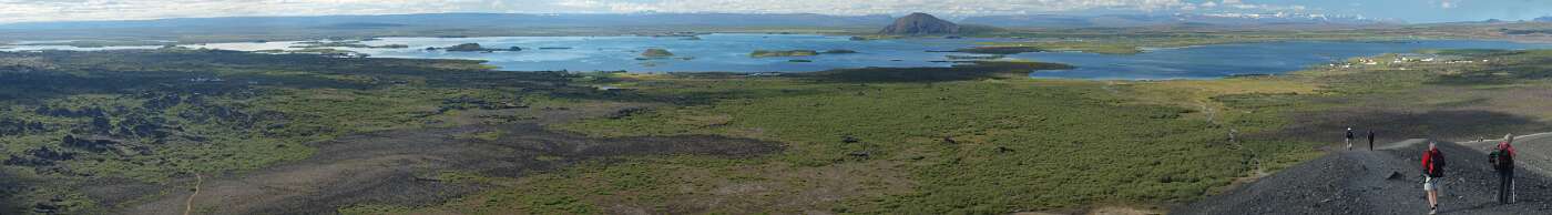 De wandeling begon in het lavalabyrint van Dimmuborgir. Tussen de grillige lavaformaties heeft zich een rijke flora kunnen ontwikkelen. We deden te lang over die wandeling en/of hebben niet op de juiste plaats dit doolhof verlaten, want we hadden geen tijd (een deel van de groep had 's avonds een afspraak om naar walvissen te gaan kijken) meer om een vulkanische spleet met vele grillige vulkaankratertjes te bekijken. We maakten nog wel een korte klim naar de rand van de explosiekrater Hverfjall. De inspanning werd beloond met een schitterend uitzicht over de omgeving van Myvatn. Bij de warmwatergrotten van Grótagjá en Stóragjá stond Anique weer klaar met drankjes en de haar bus. Wandeling: 6,5 uur, 15 km, hoogteverschil 150 m.