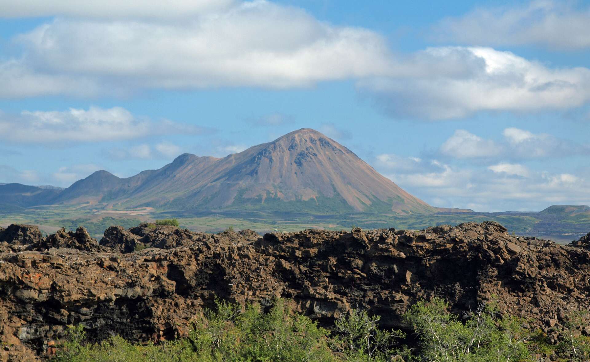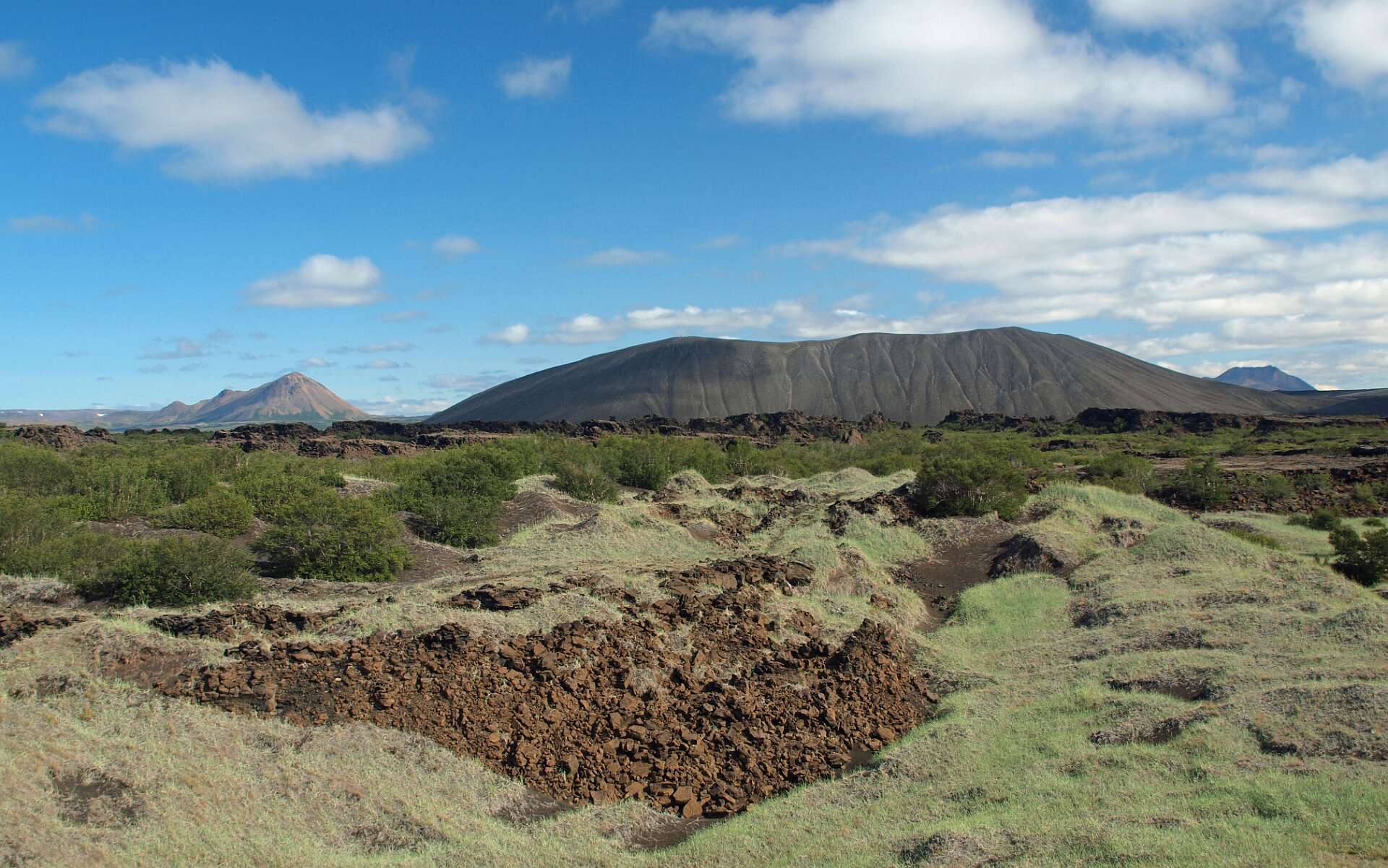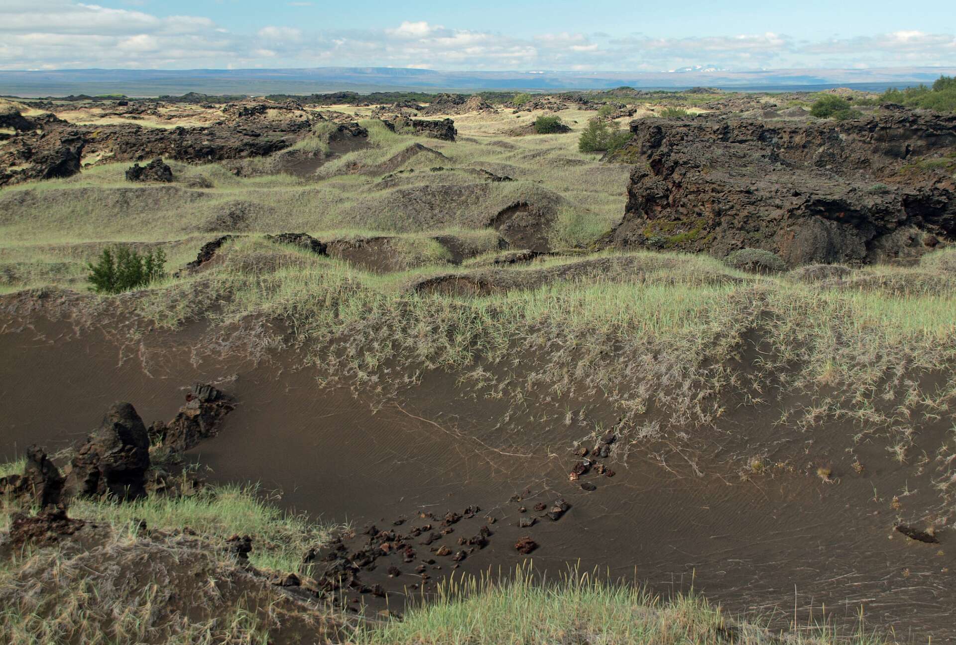 De wandeling begon in het lavalabyrint van Dimmuborgir. Tussen de grillige lavaformaties heeft zich een rijke flora kunnen ontwikkelen. We deden te lang over die wandeling en/of hebben niet op de juiste plaats dit doolhof verlaten, want we hadden geen tijd (een deel van de groep had 's avonds een afspraak om naar walvissen te gaan kijken) meer om een vulkanische spleet met vele grillige vulkaankratertjes te bekijken. We maakten nog wel een korte klim naar de rand van de explosiekrater Hverfjall. De inspanning werd beloond met een schitterend uitzicht over de omgeving van Myvatn. Bij de warmwatergrotten van Grótagjá en Stóragjá stond Anique weer klaar met drankjes en de haar bus. Wandeling: 6,5 uur, 15 km, hoogteverschil 150 m.