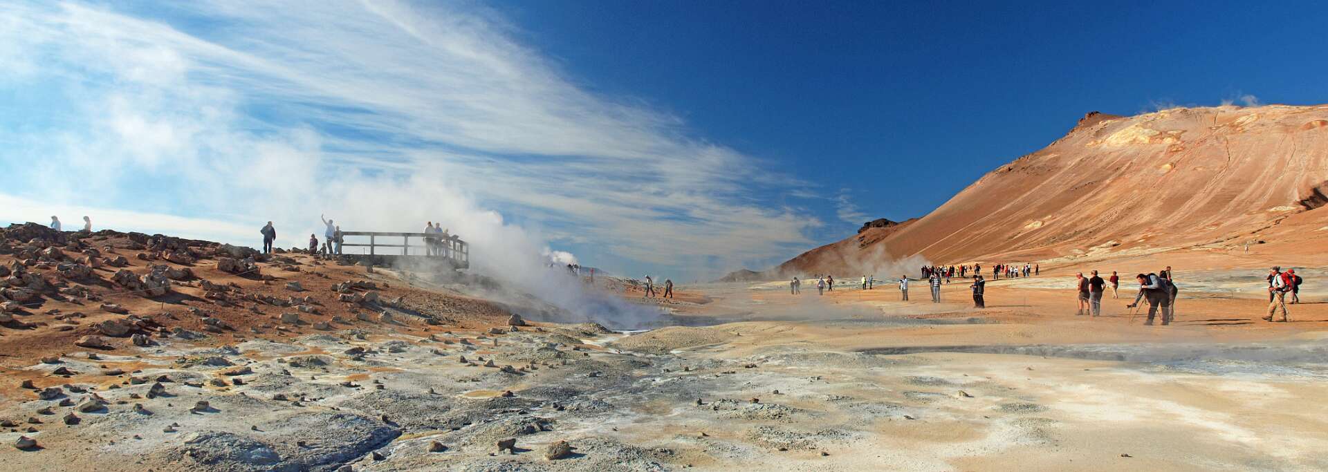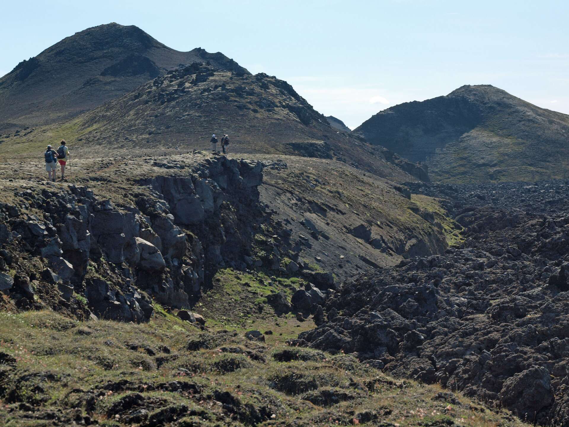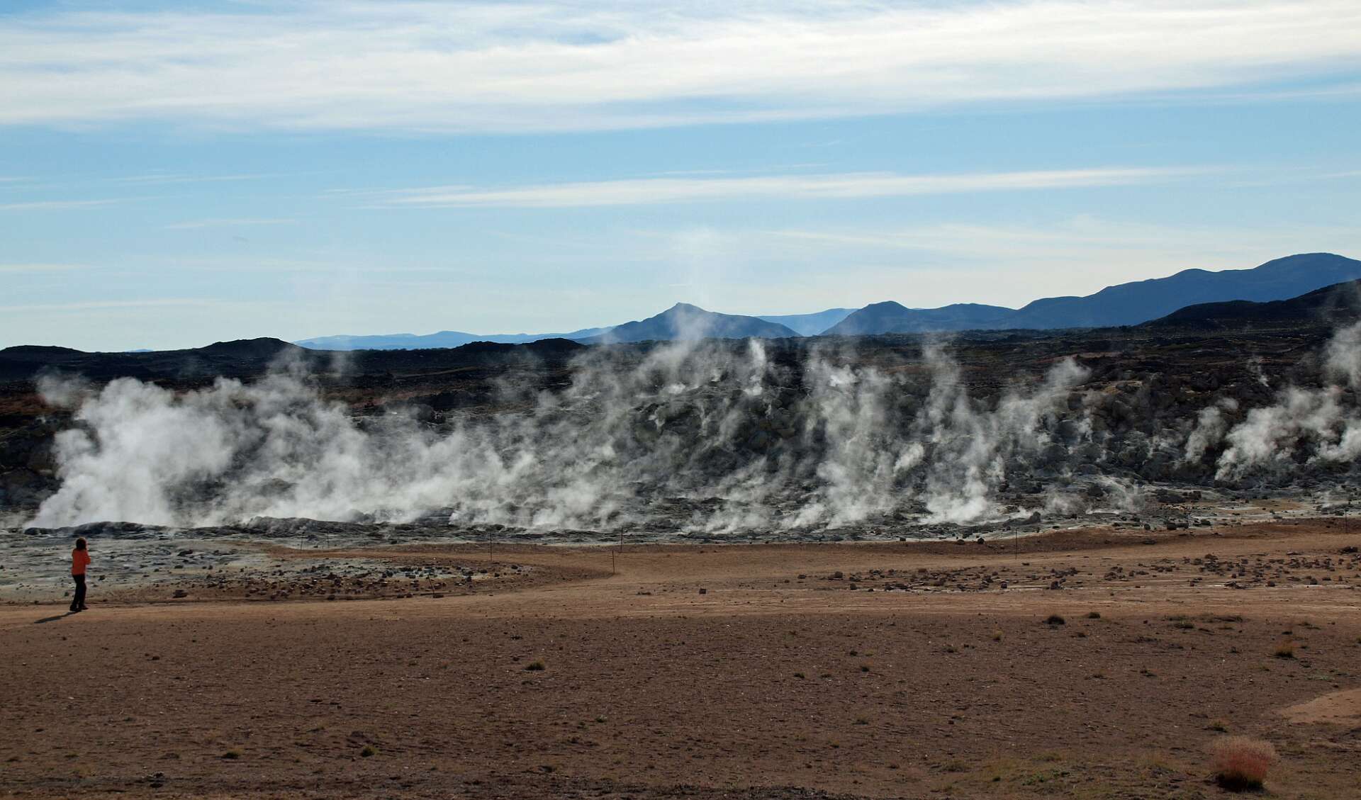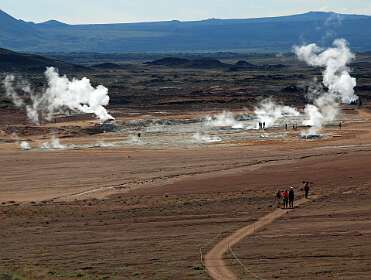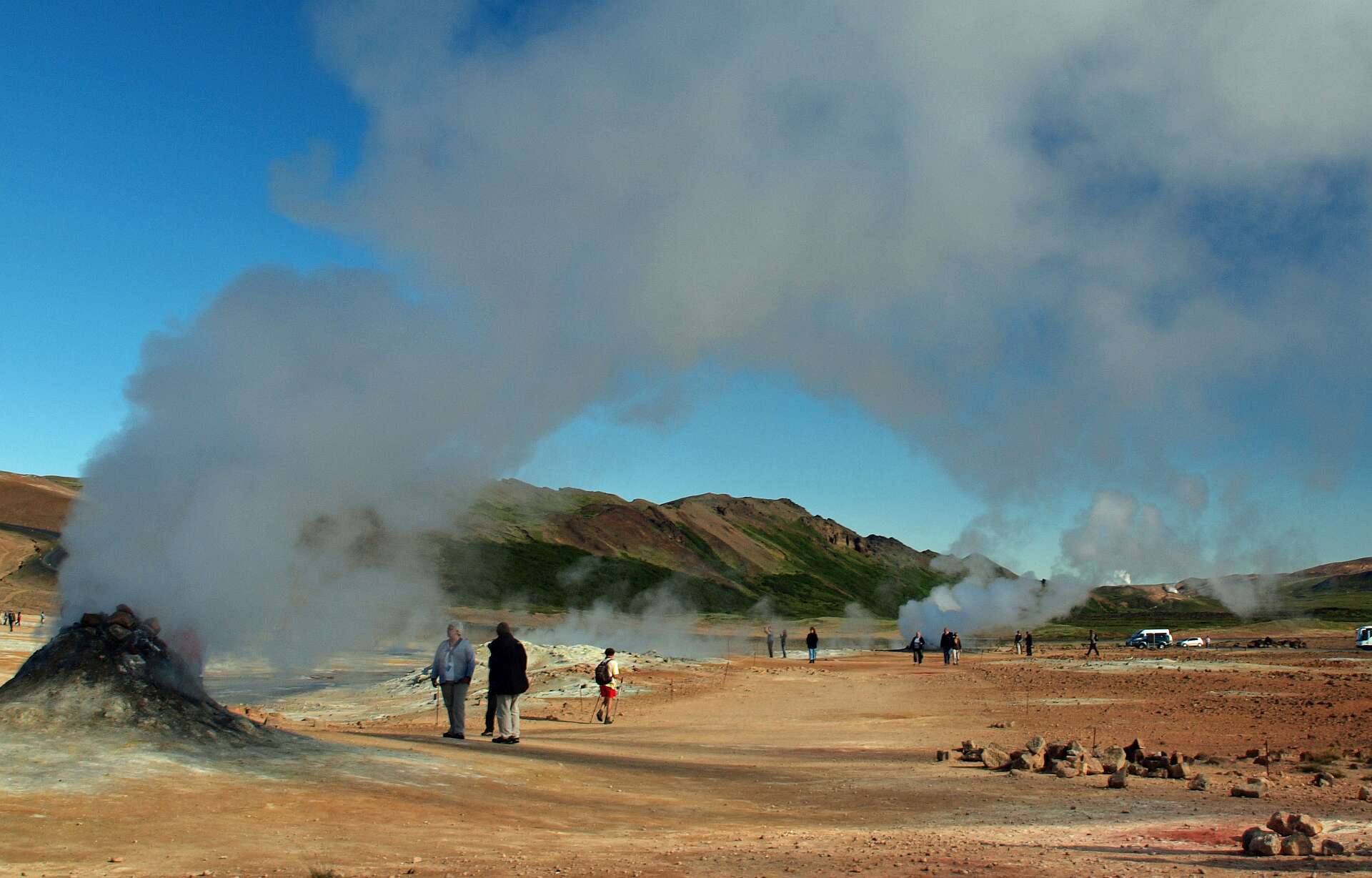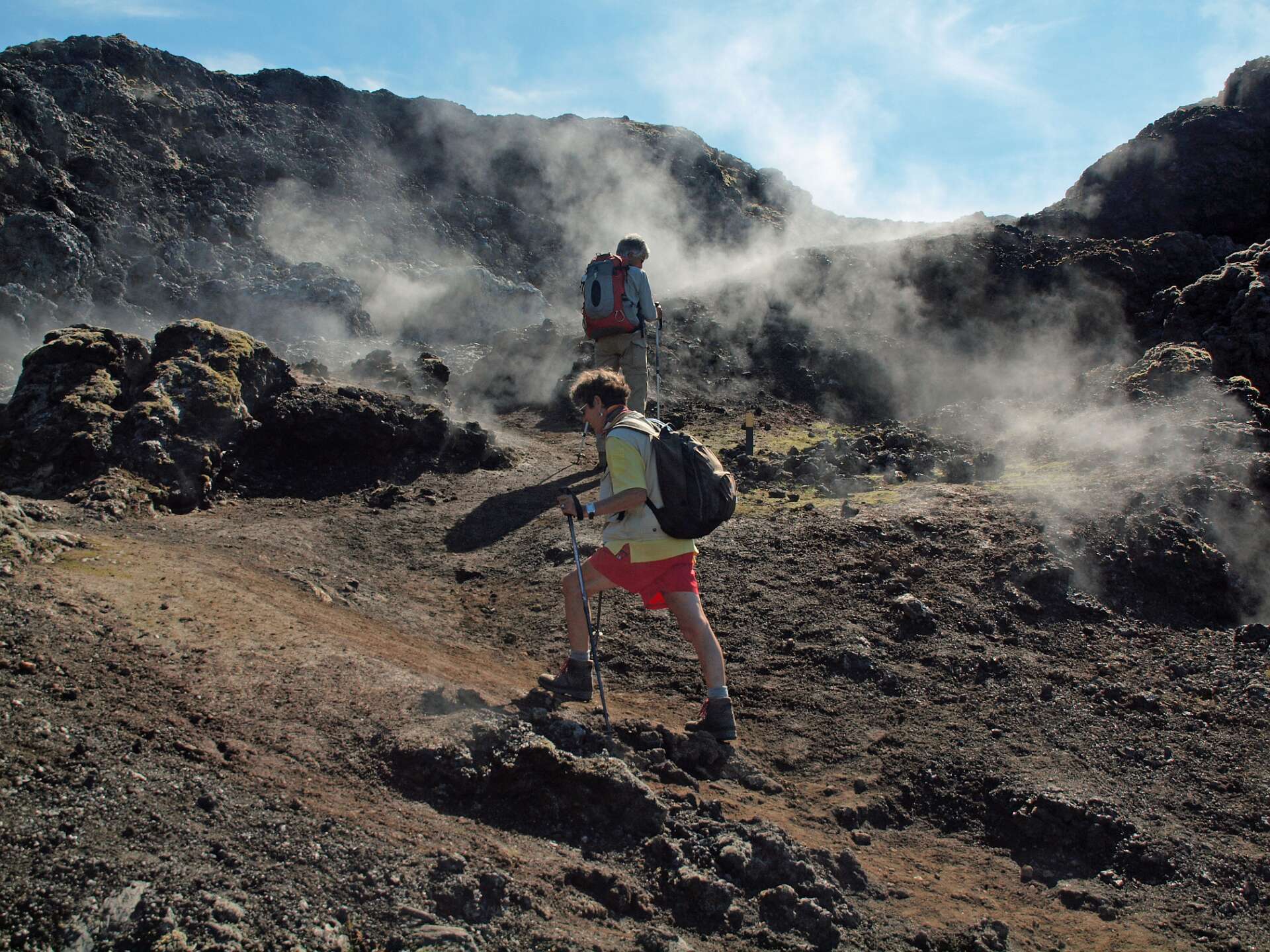 's Morgens reden we naar de Námaskard pas. Hier liggen dampende en sissende zwavelbronnen, pruttelende modderpoelen en bulderende stoombronnen, gehuld in een zwavelig rookgordijn. Op de pas begon de eerste korte wandeling, de beklimming van Mount Námafjall. Daarna reden we naar de nabijgelegen Viti (explosie krater) achter de Krafla centrale We wandelden over een deel van de krater rand. Vervolgens begonnen we aan de 13 km lange wandeling door het Leirhnúkur gebied terug naar de Námaskard pas. Tijdens de wandeling volgden we een historische lavastroom en maakten we kennis met lavatunnels en dampende kraters: een zeer indrukwekkend maanlandschap! Na deze wandeling reden we weer terug naar ons onderkomen. Alle wandeling samen: 7 uur, 17 km, 250m omhoog en 350m omlaag.