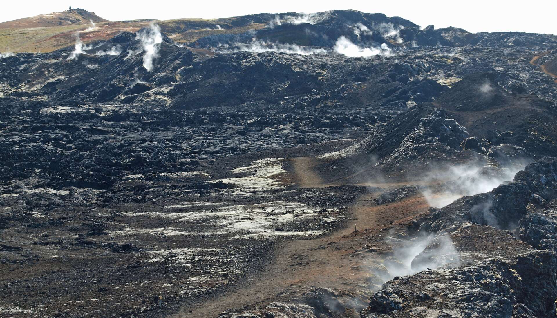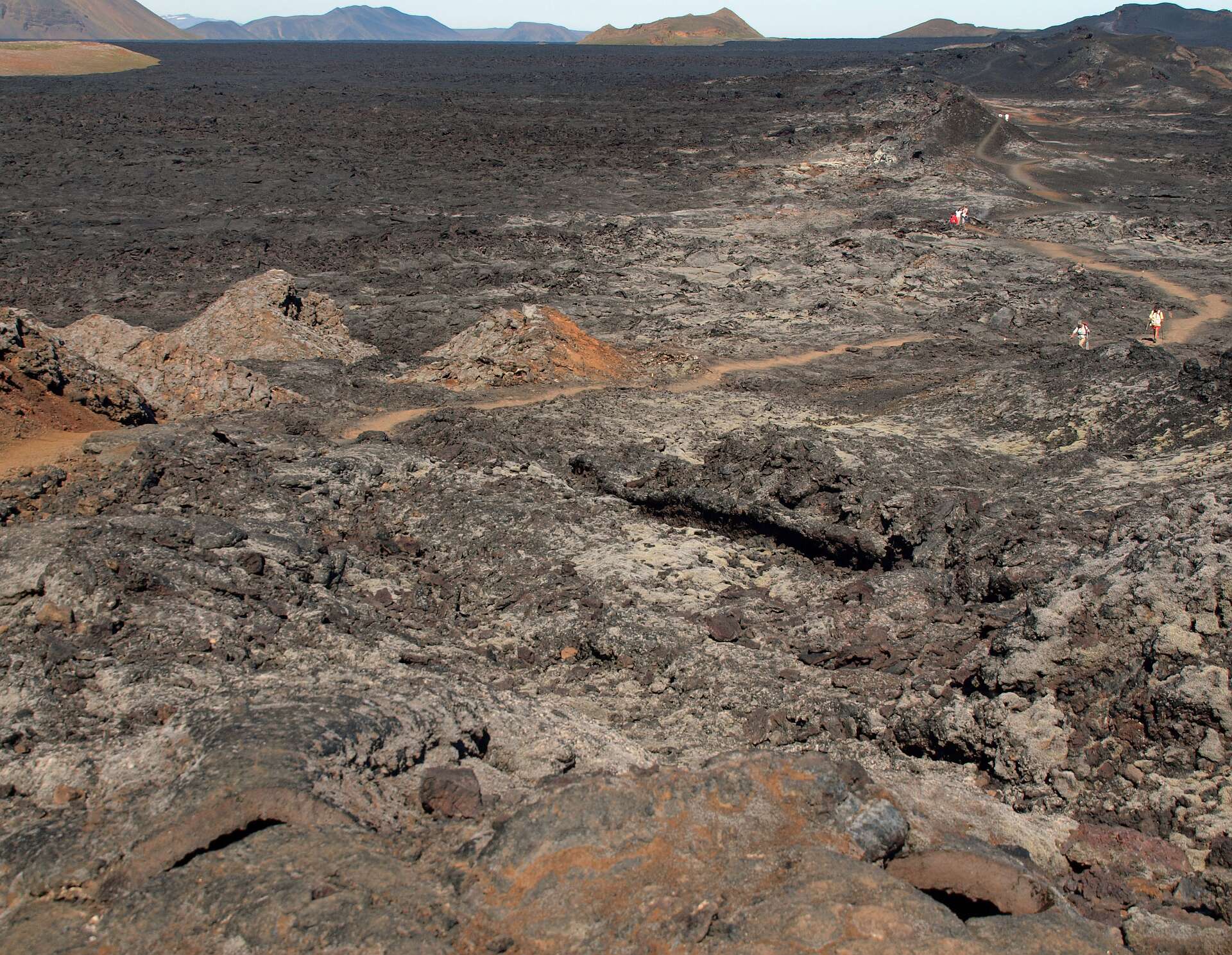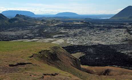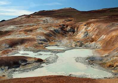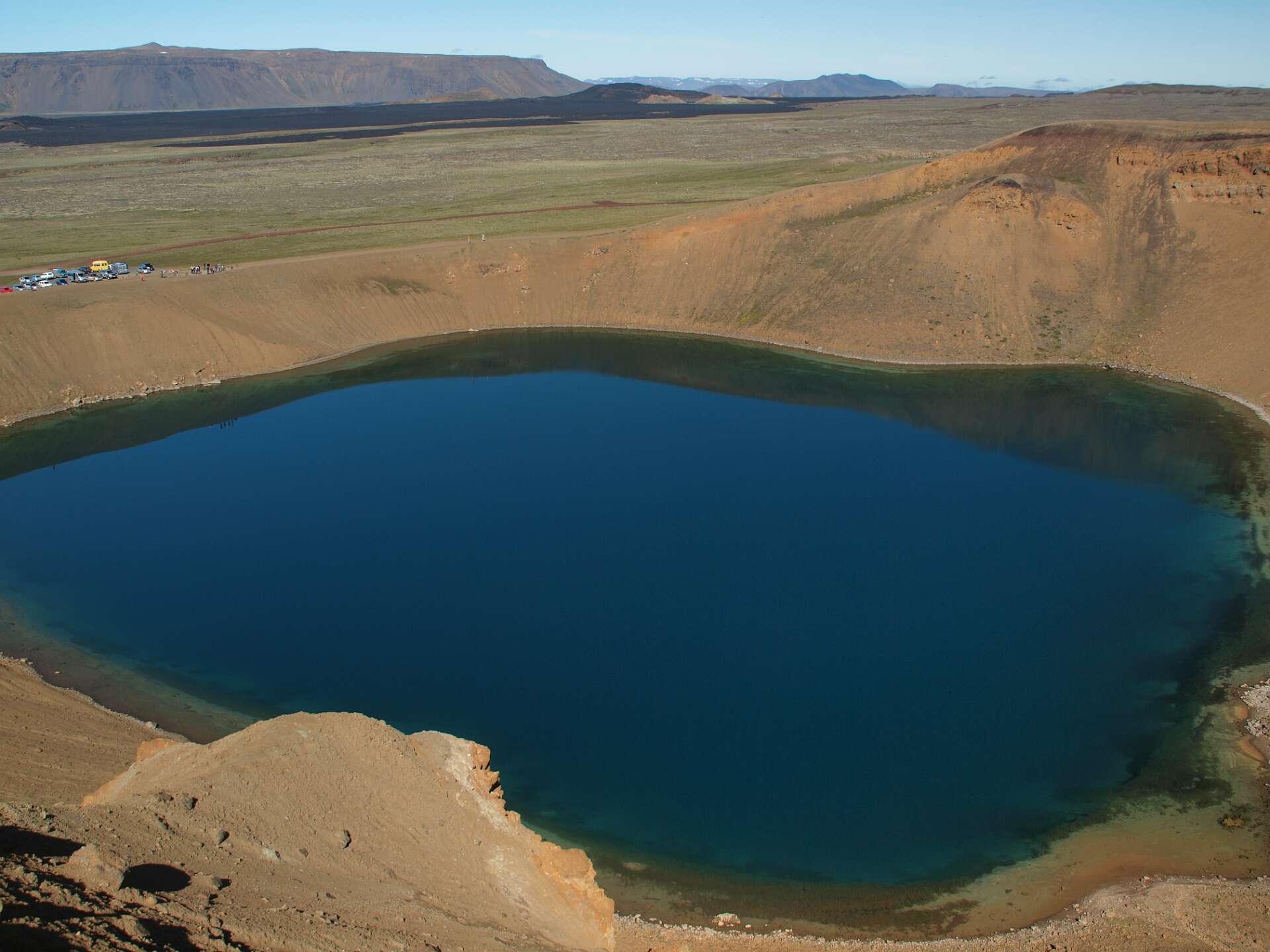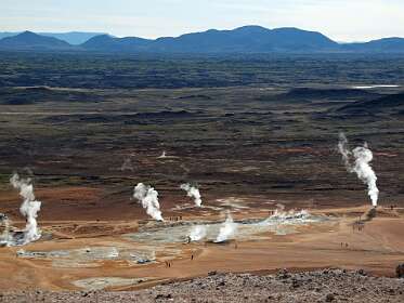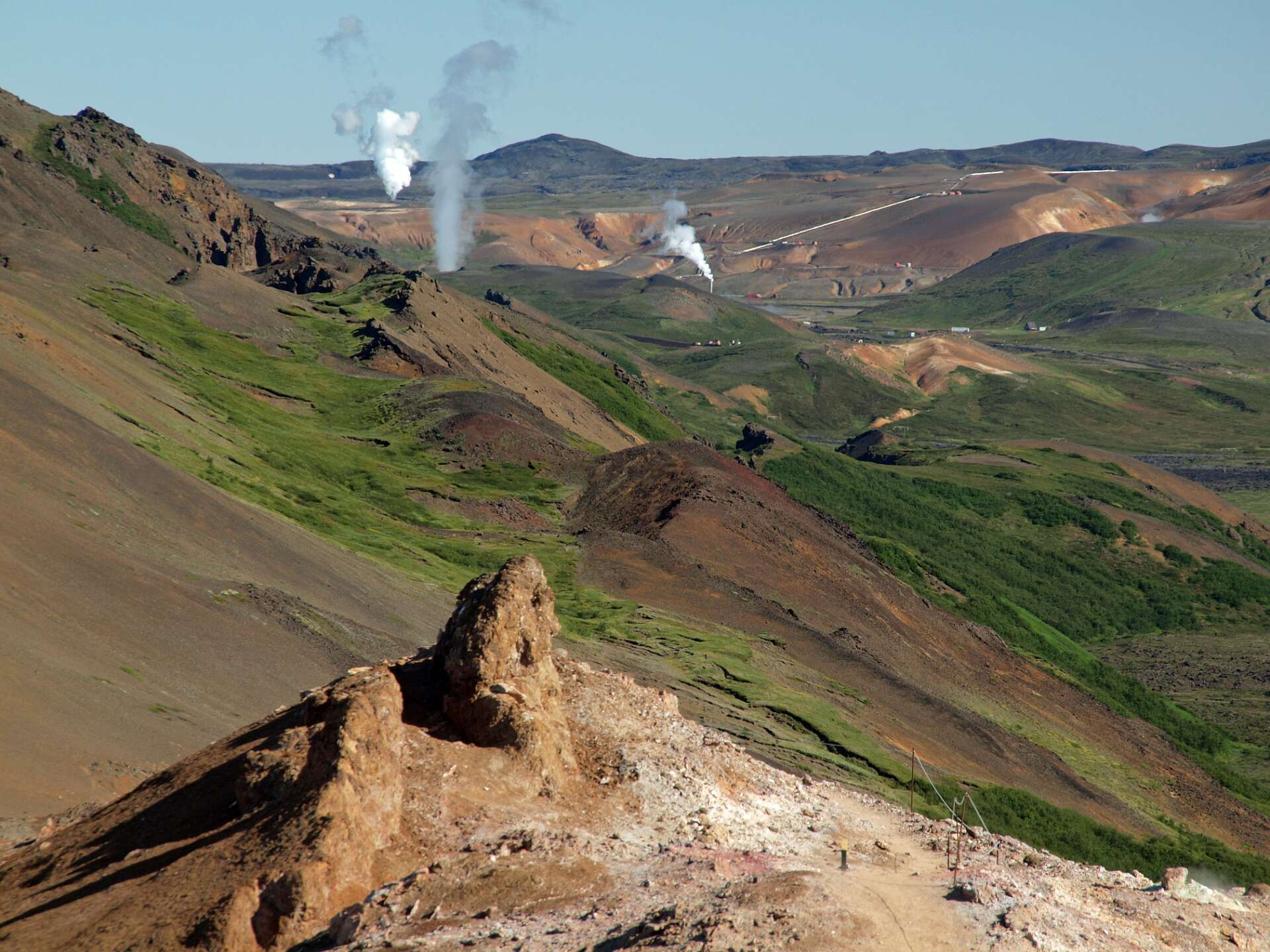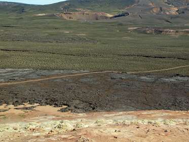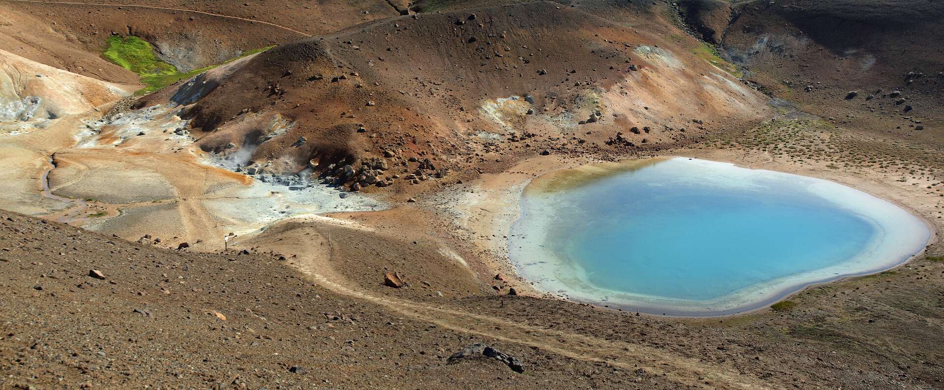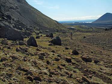 's Morgens reden we naar de Námaskard pas. Hier liggen dampende en sissende zwavelbronnen, pruttelende modderpoelen en bulderende stoombronnen, gehuld in een zwavelig rookgordijn. Op de pas begon de eerste korte wandeling, de beklimming van Mount Námafjall. Daarna reden we naar de nabijgelegen Viti (explosie krater) achter de Krafla centrale We wandelden over een deel van de krater rand. Vervolgens begonnen we aan de 13 km lange wandeling door het Leirhnúkur gebied terug naar de Námaskard pas. Tijdens de wandeling volgden we een historische lavastroom en maakten we kennis met lavatunnels en dampende kraters: een zeer indrukwekkend maanlandschap! Na deze wandeling reden we weer terug naar ons onderkomen. Alle wandeling samen: 7 uur, 17 km, 250m omhoog en 350m omlaag.
