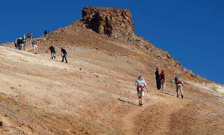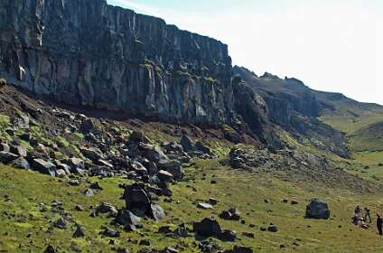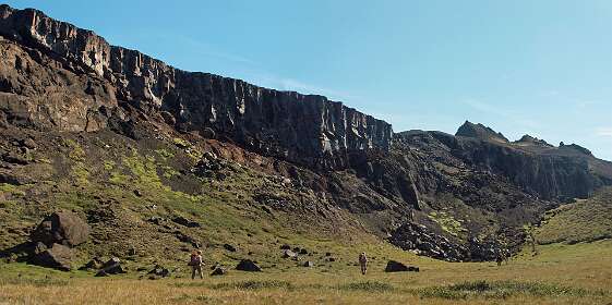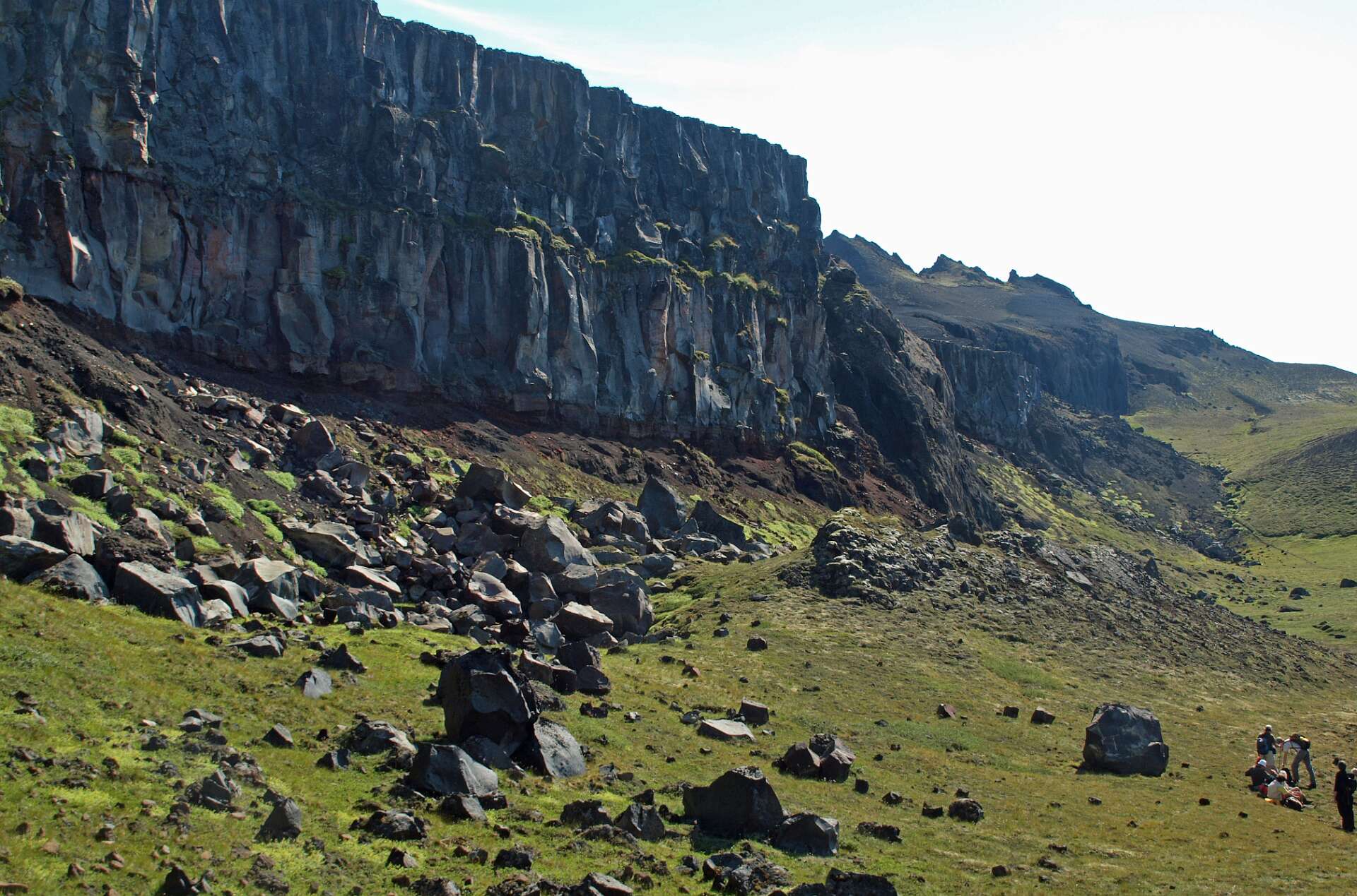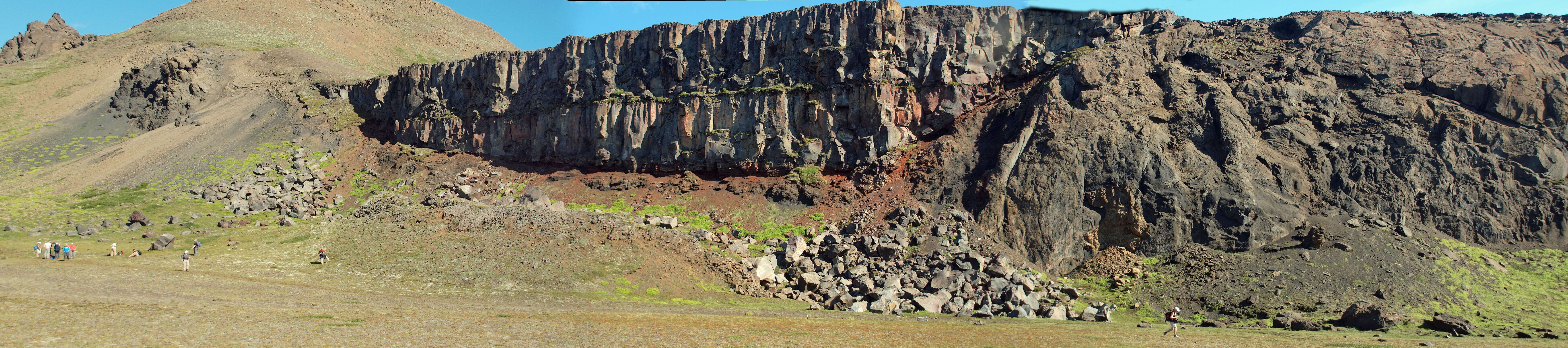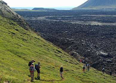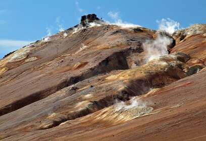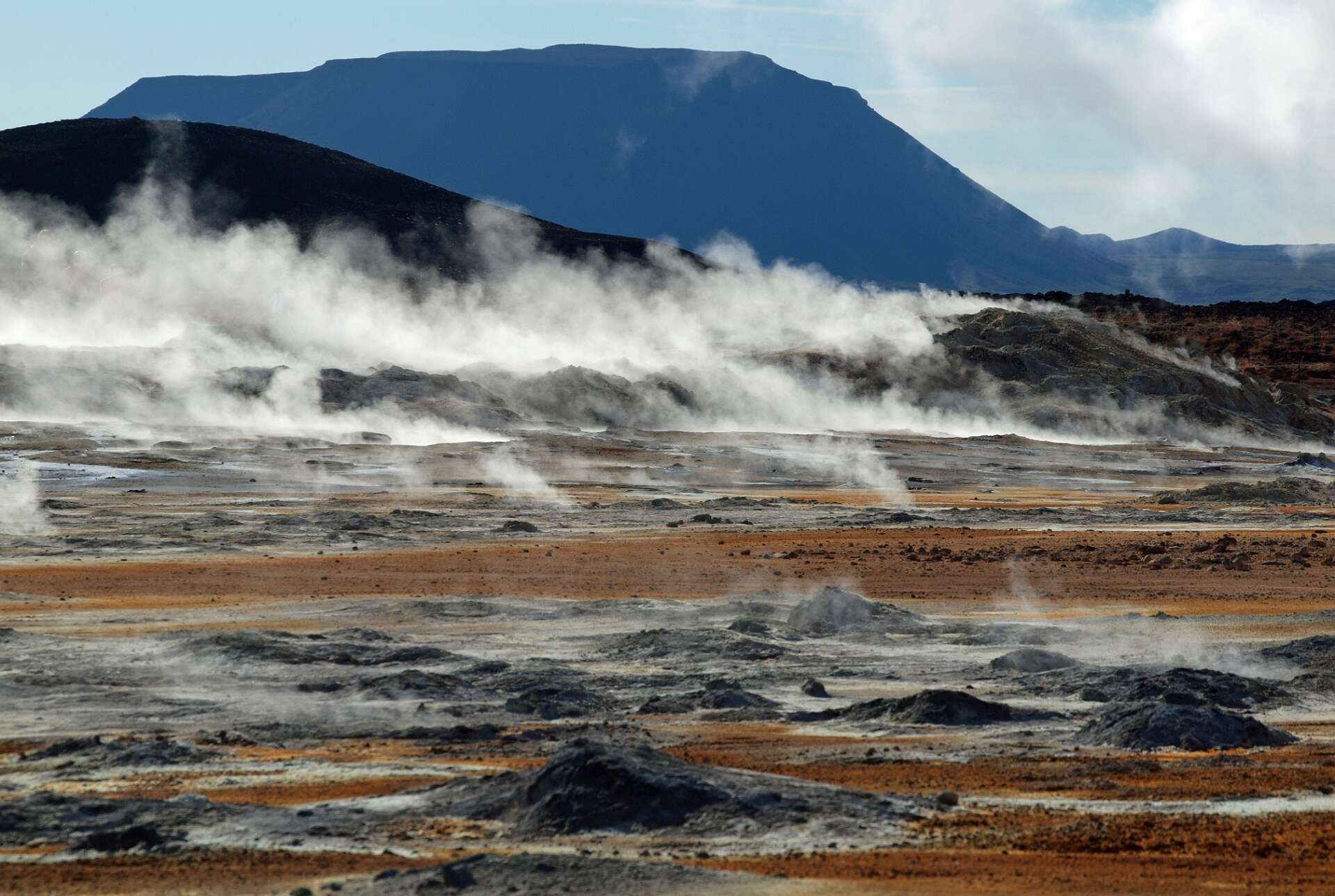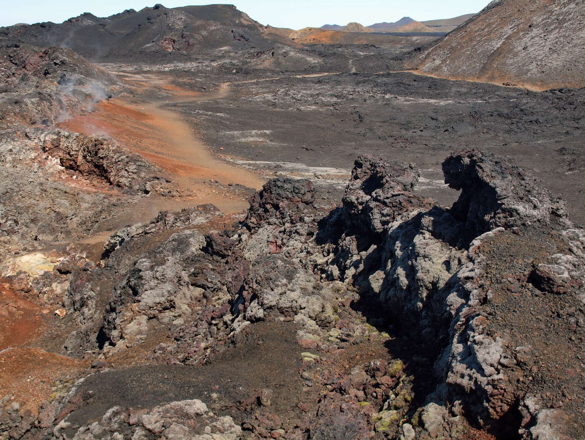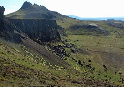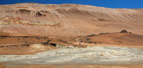 's Morgens reden we naar de Námaskard pas. Hier liggen dampende en sissende zwavelbronnen, pruttelende modderpoelen en bulderende stoombronnen, gehuld in een zwavelig rookgordijn. Op de pas begon de eerste korte wandeling, de beklimming van Mount Námafjall. Daarna reden we naar de nabijgelegen Viti (explosie krater) achter de Krafla centrale We wandelden over een deel van de krater rand. Vervolgens begonnen we aan de 13 km lange wandeling door het Leirhnúkur gebied terug naar de Námaskard pas. Tijdens de wandeling volgden we een historische lavastroom en maakten we kennis met lavatunnels en dampende kraters: een zeer indrukwekkend maanlandschap! Na deze wandeling reden we weer terug naar ons onderkomen. Alle wandeling samen: 7 uur, 17 km, 250m omhoog en 350m omlaag.