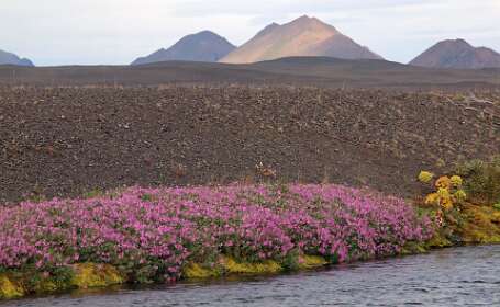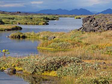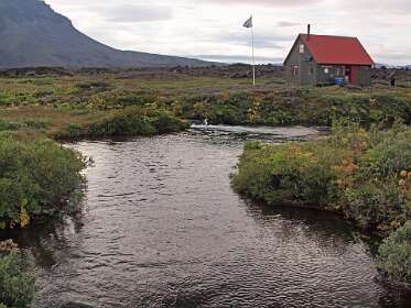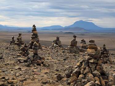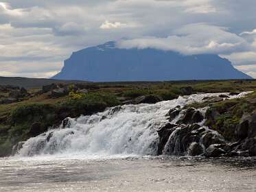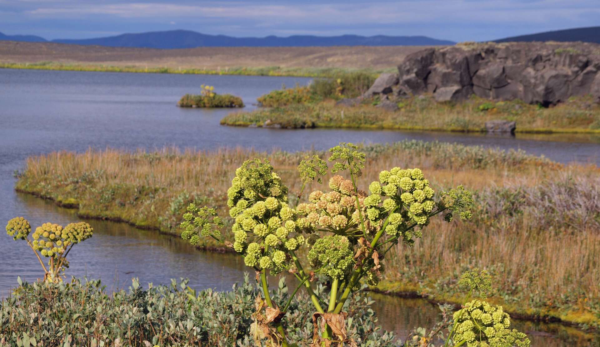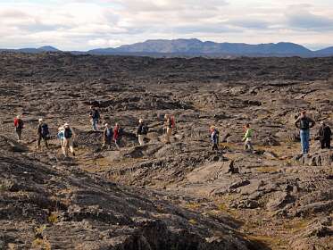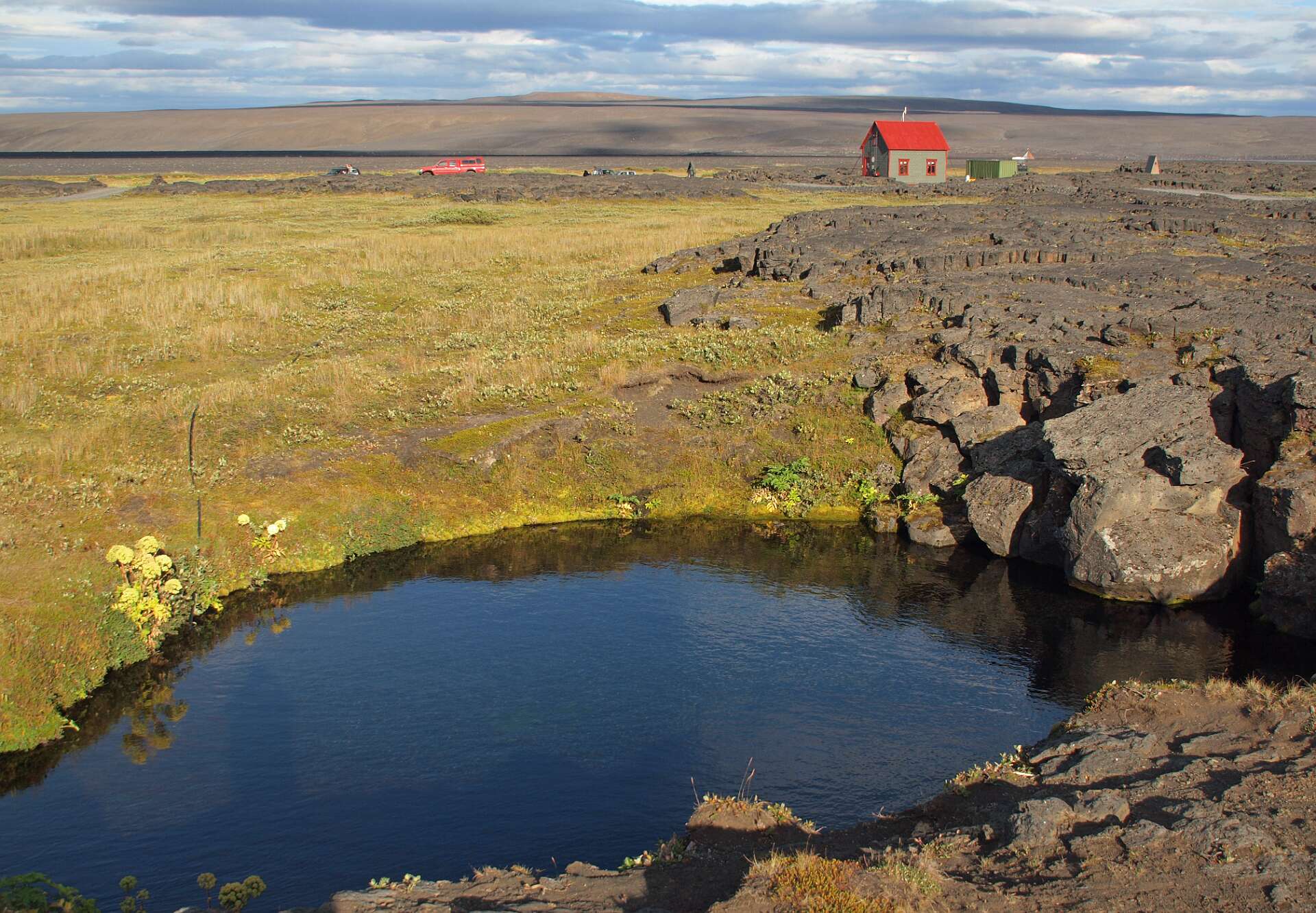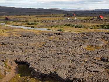 ’s Morgens reden we langs de noordelijke kust naar Vopnafjördur, waar Anique voor een paar dagen inkopen deed. Vervolgens trokken we de echte binnenlanden in, naar het Ódádarhaun, het lavaveld van de misdadigers. Aan de voet van de majestueuze Herdubreid ligt de kleine hut van Herdubreidarlindir. Hier maakten we een wandeling door het Ódádahraun. Aan deze oase is de naam verbonden van de legendarische bandiet Eyvindur Jónsson. Eén van Eyvindurs schuilplaatsen bevindt zich in de nabijheid van de hut. Wandeling: 2 uur, 4,5 km, geen hoogteverschil.