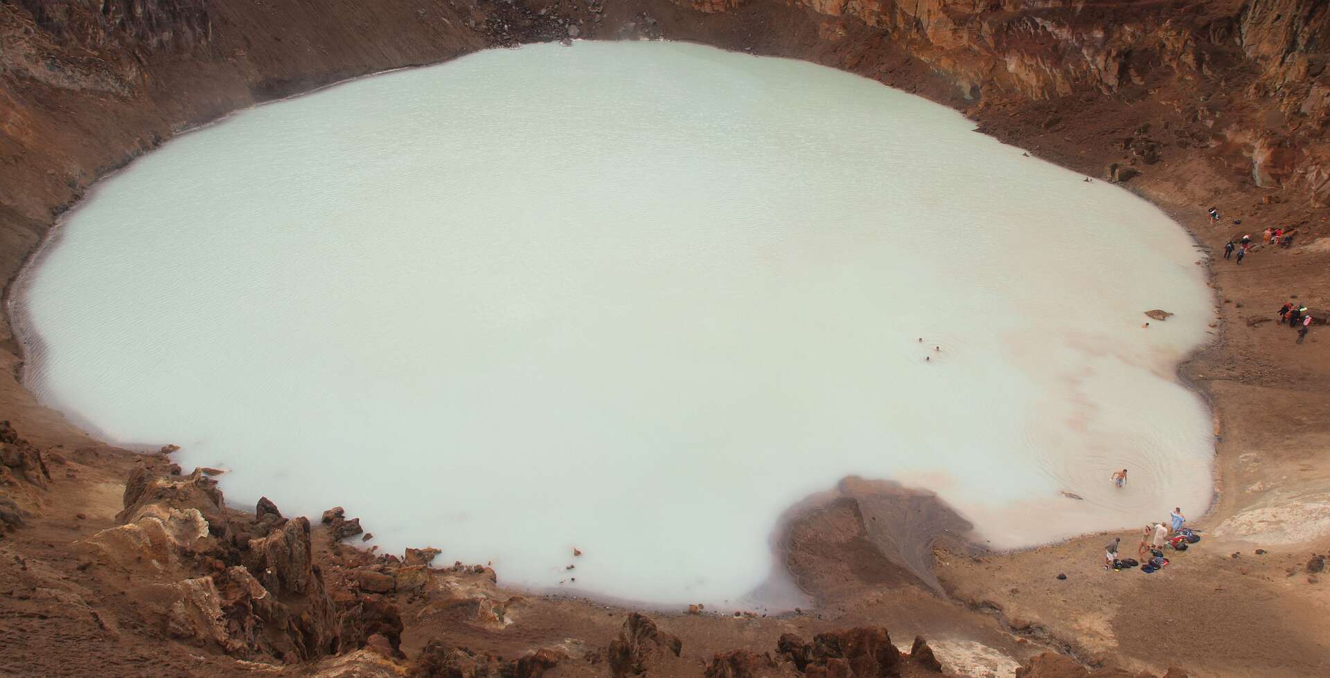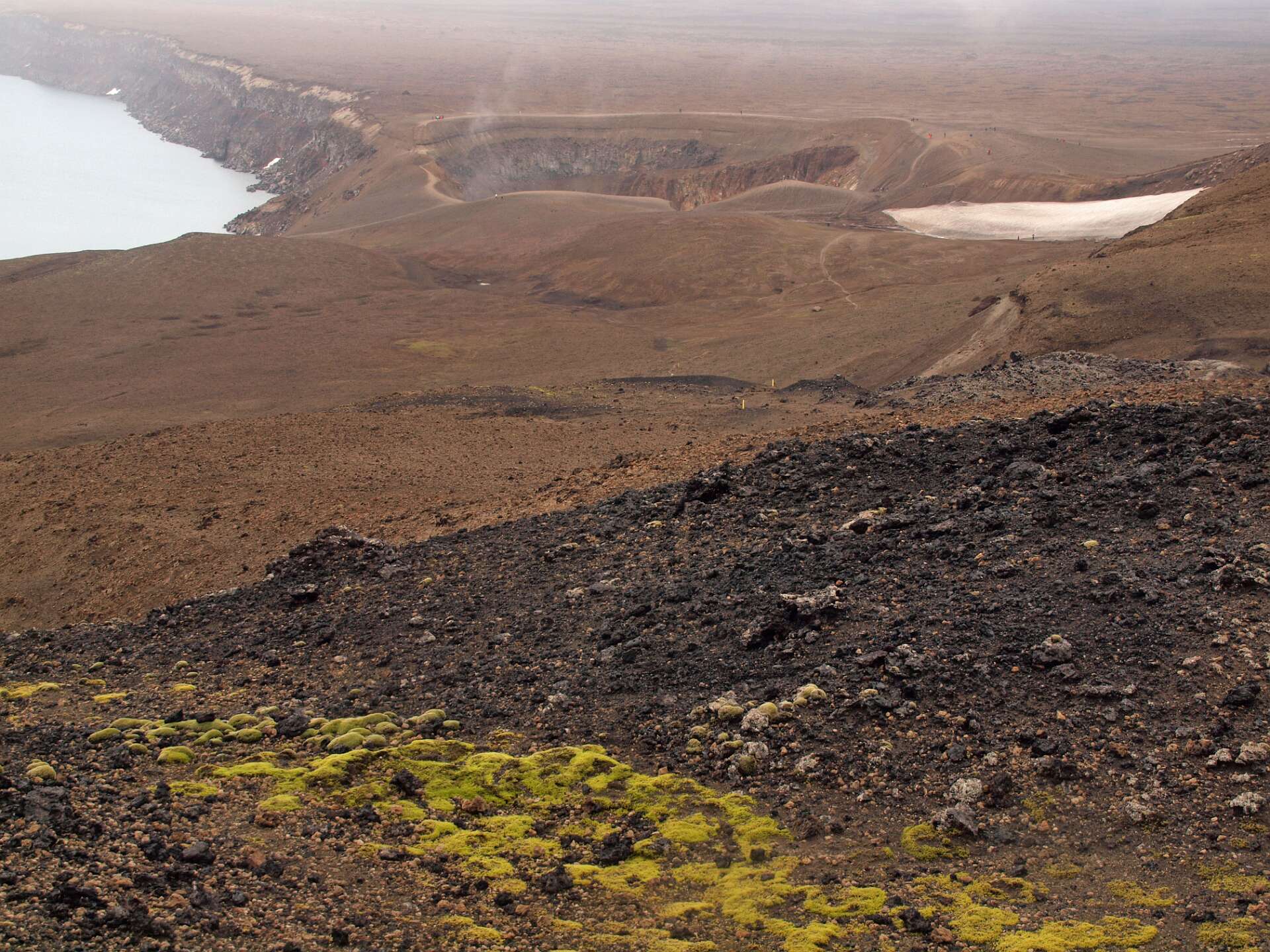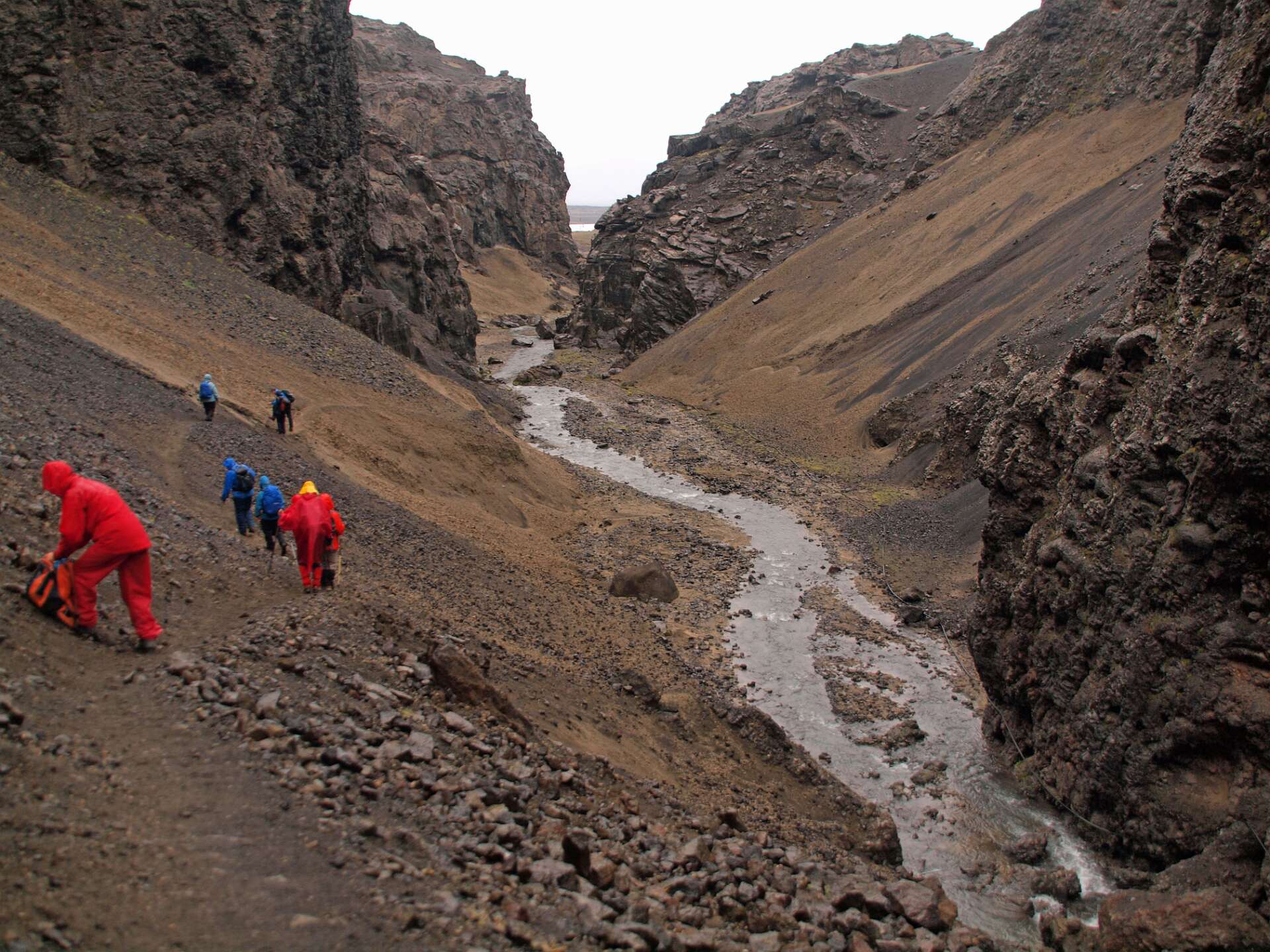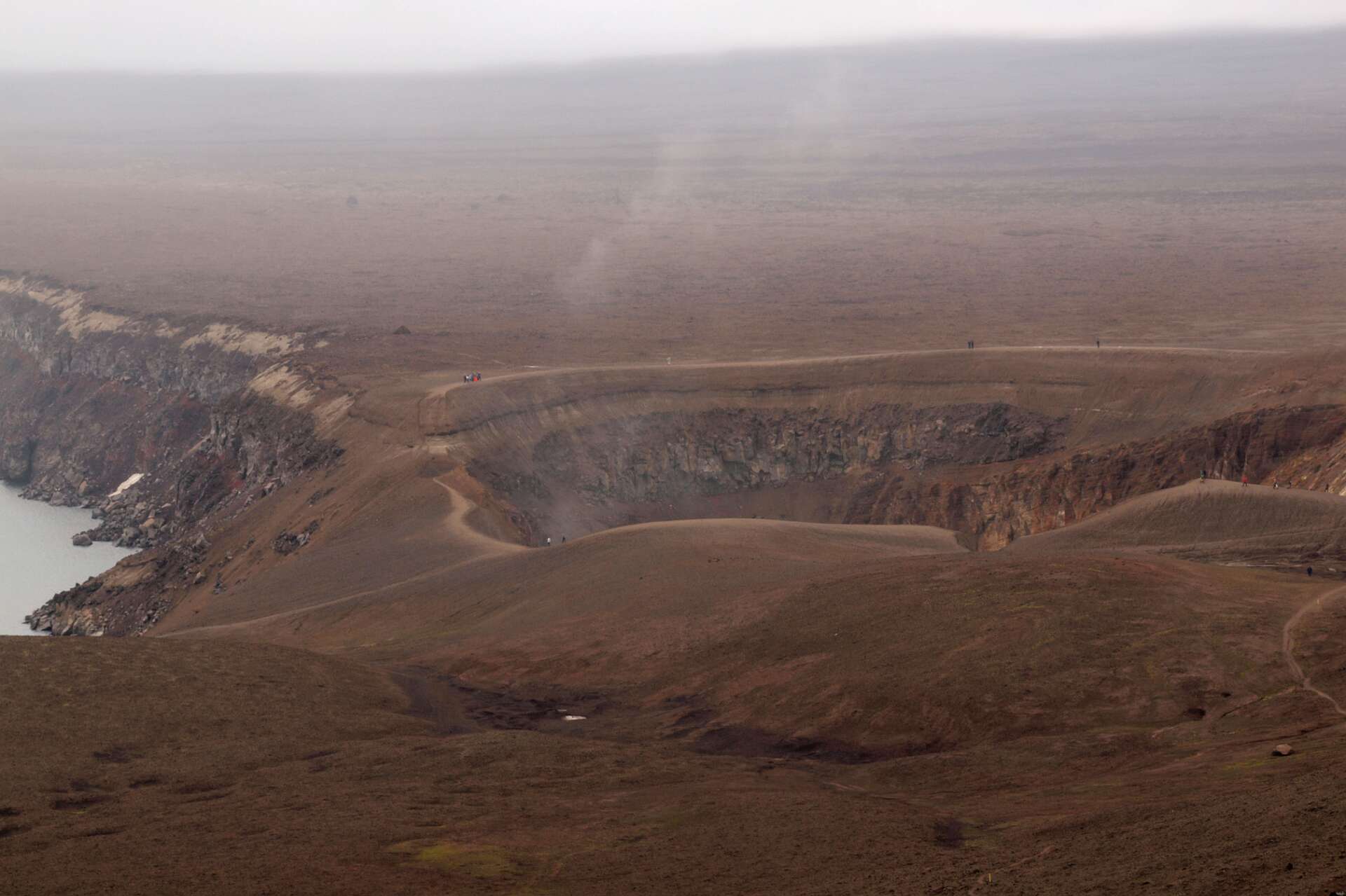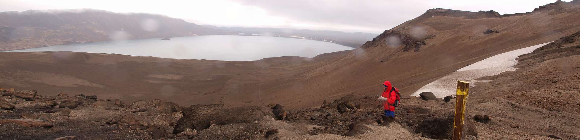 We reden eerst over zwartgrijze lavavelden langs de Herdubreid en daarna over een vlakte bedekt met een dikke laag puimsteen naar de Dreka camping waar we gingen wandelen. Eerst liepen we naar de waterval in de Drekagil kloof. Daarna klommen we met regen en harde wind de Askja op en daalden daarna af naar het Öskjuvatn kratermeer. Het bad in de kleine explosiekrater van de Viti, gevuld met warme zwavelige ‘melk’ sloegen de meeste over. Daarna reden we terug naar Herdubreidarlindir. Wandeling 5 uur, 12,5 km, 700 m stijgen en 400 m dalen.