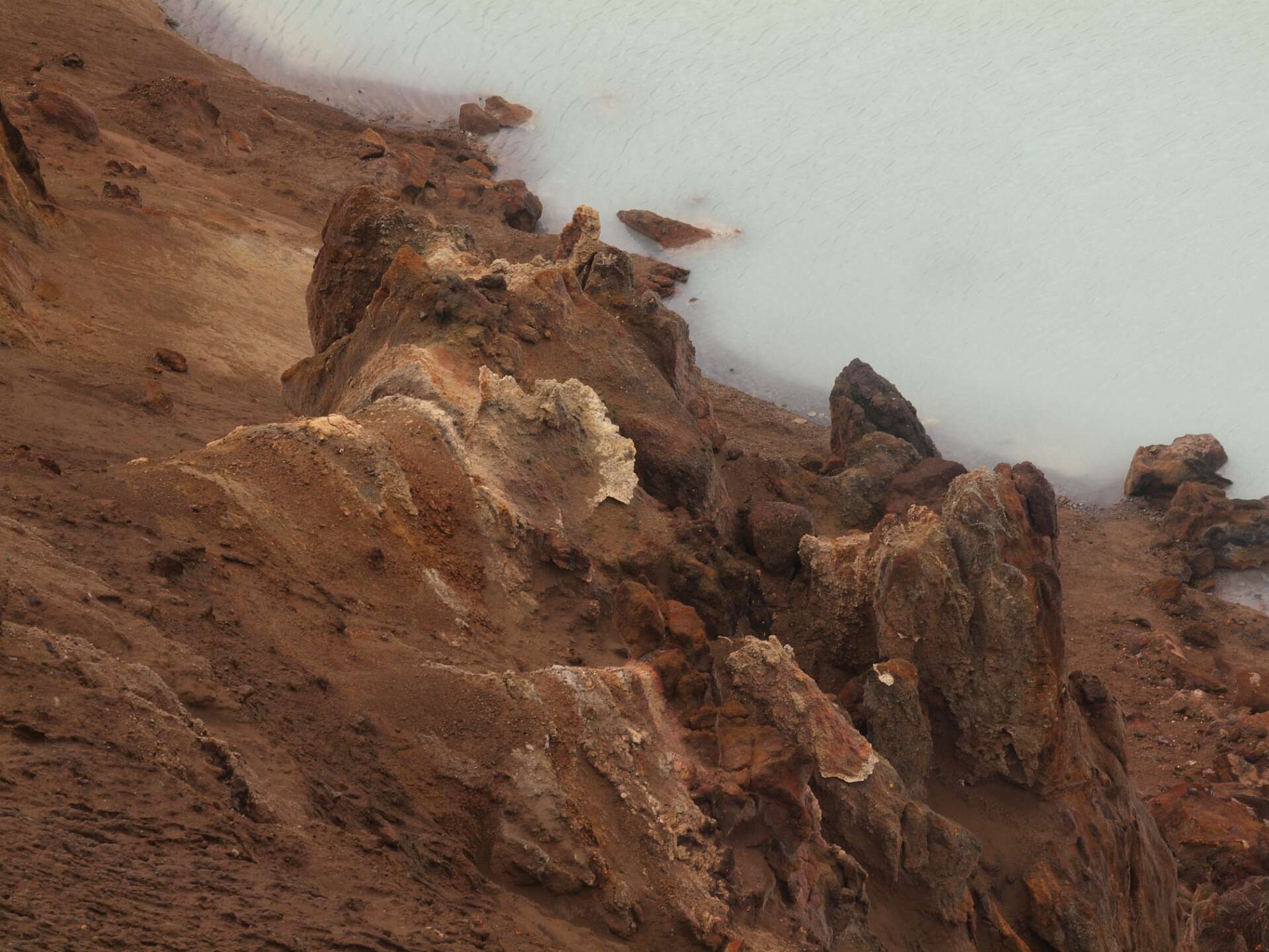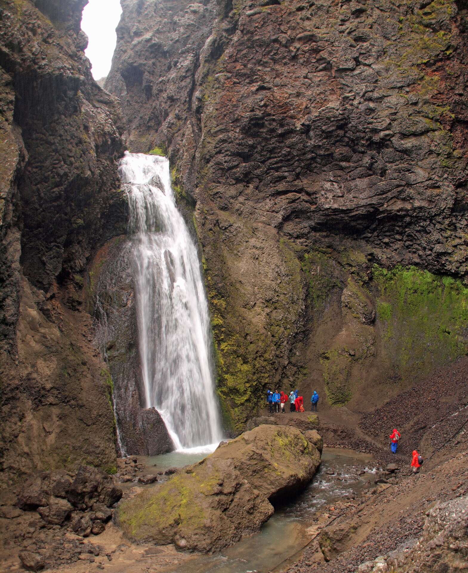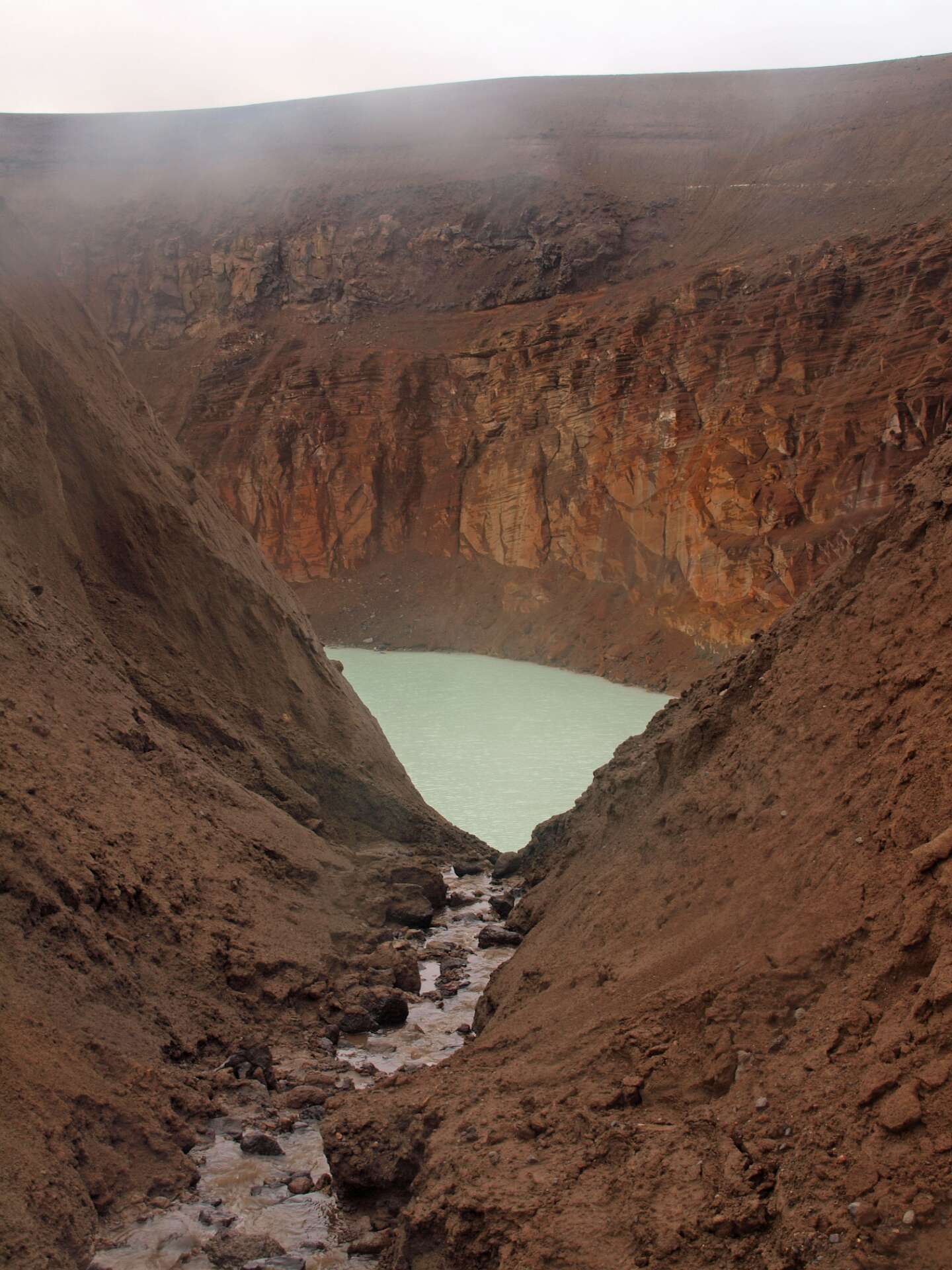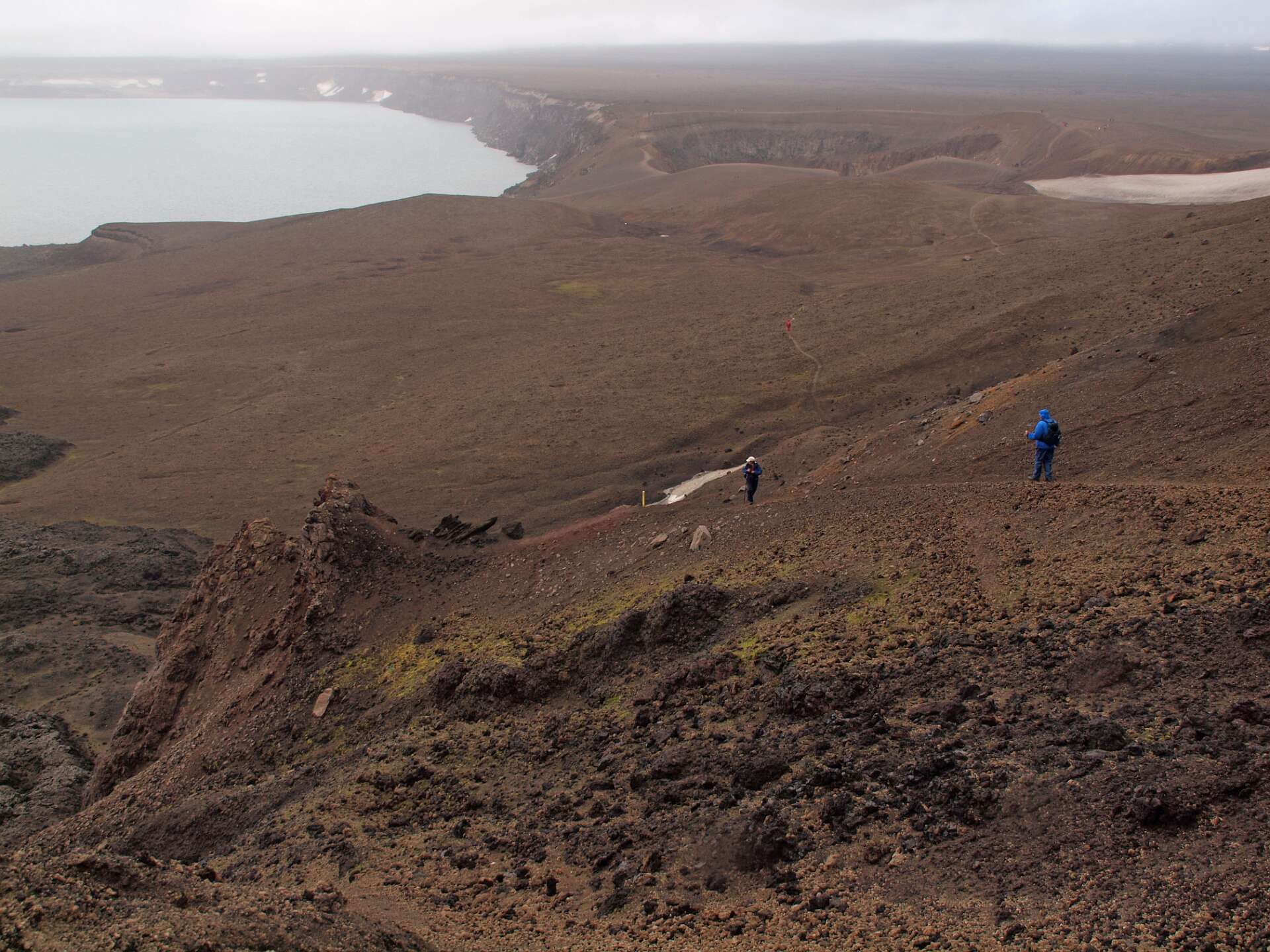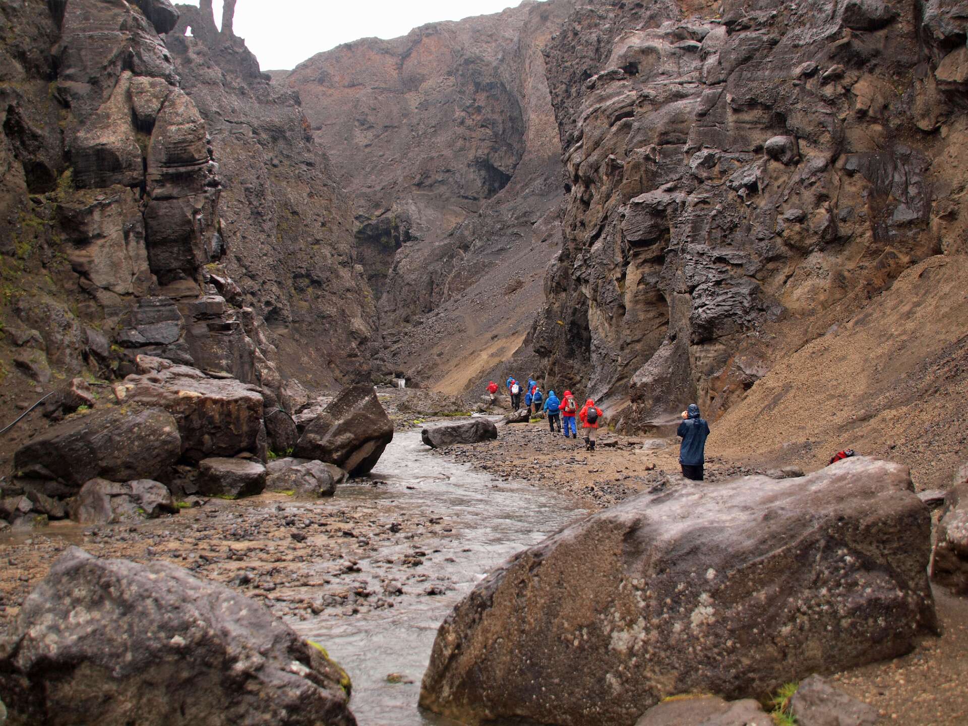We reden eerst over zwartgrijze lavavelden langs de Herdubreid en daarna over een vlakte bedekt met een dikke laag puimsteen naar de Dreka camping waar we gingen wandelen. Eerst liepen we naar de waterval in de Drekagil kloof. Daarna klommen we met regen en harde wind de Askja op en daalden daarna af naar het Öskjuvatn kratermeer. Het bad in de kleine explosiekrater van de Viti, gevuld met warme zwavelige ‘melk’ sloegen de meeste over. Daarna reden we terug naar Herdubreidarlindir. Wandeling 5 uur, 12,5 km, 700 m stijgen en 400 m dalen.