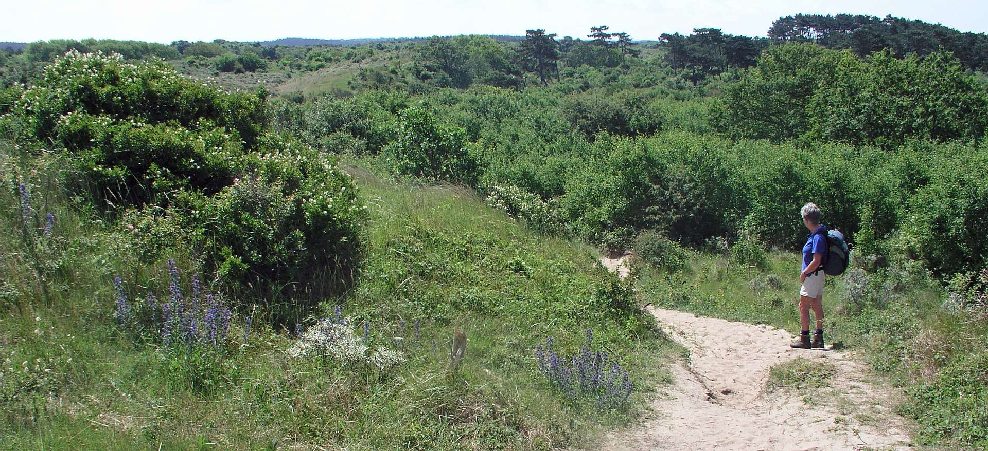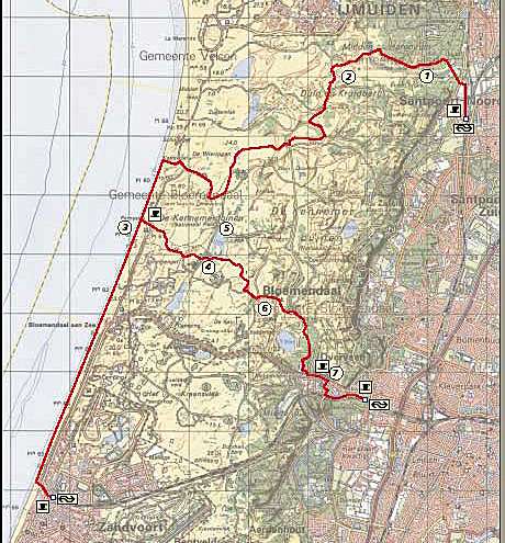 De wandeling begint op station Santpoort Noord en slingert door de landgoederen Midden Herenduin, Duinen Kruidberg en de Kennemerduinen, alle drie deel uitmakend van het Nationaal Park Zuid-Kennemerland. Wij liepen deze 15 km lange wandeling in juni 2003.