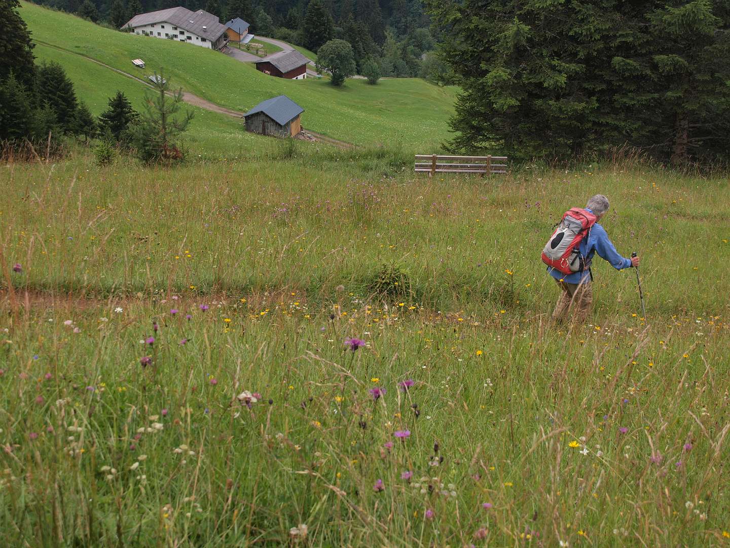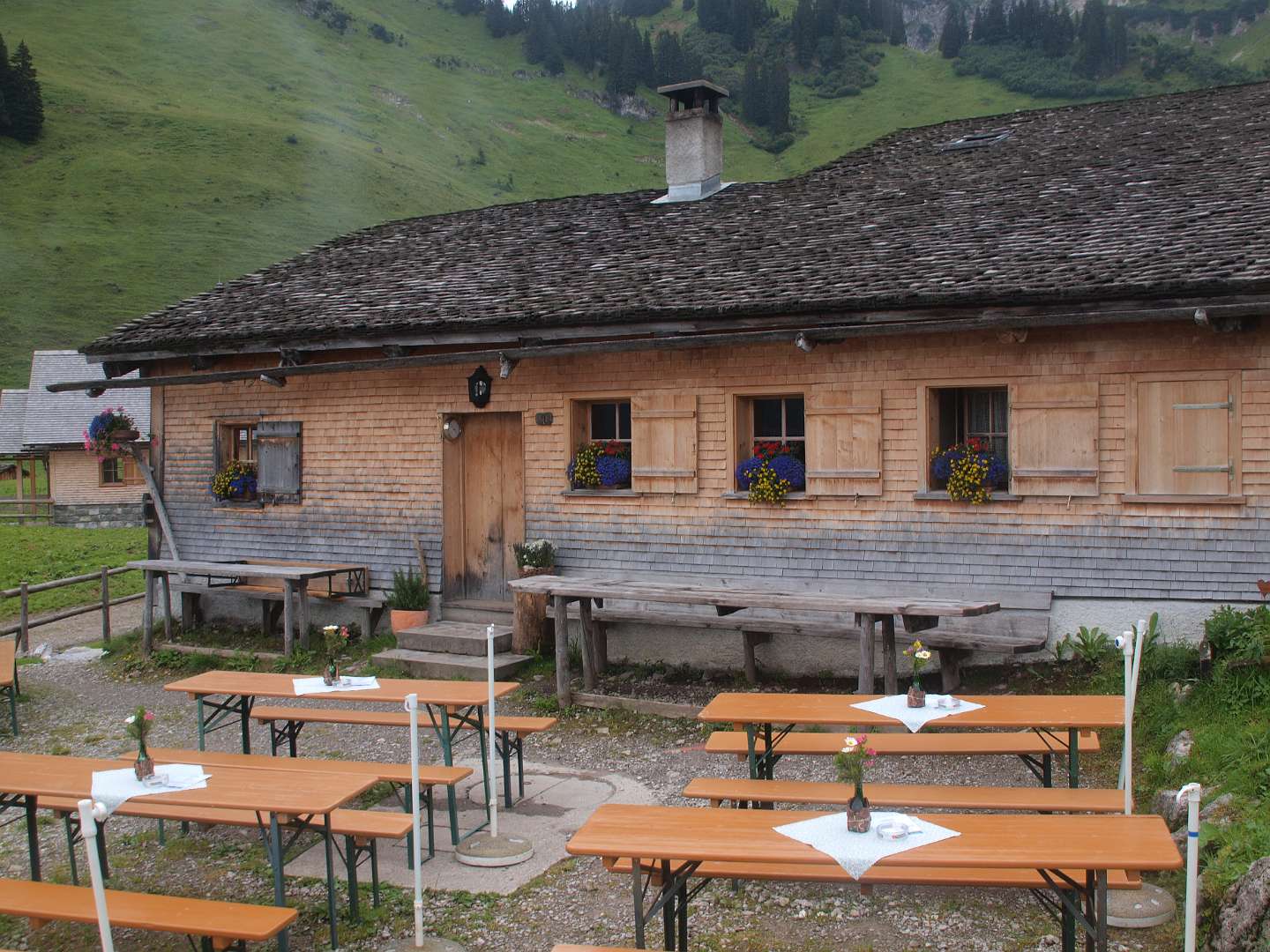 We reden met de bus naar Sonntag en gingen daar met de kabelbaan omhoog naar Stein. Daar begon de 13km lange wandeling terug naar de camping.