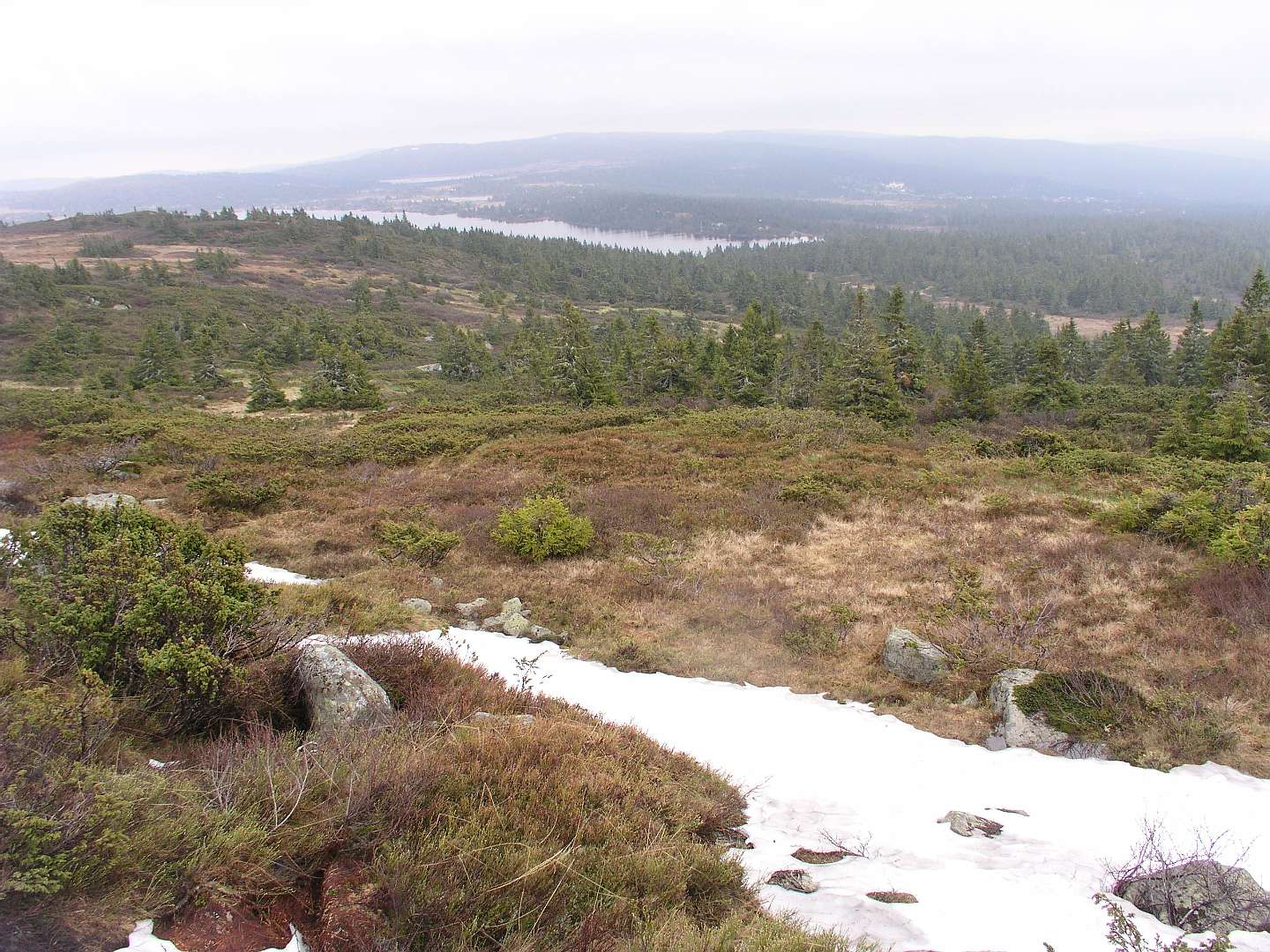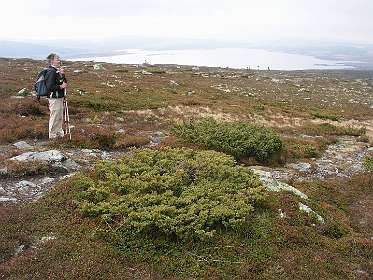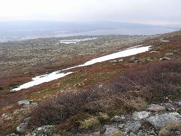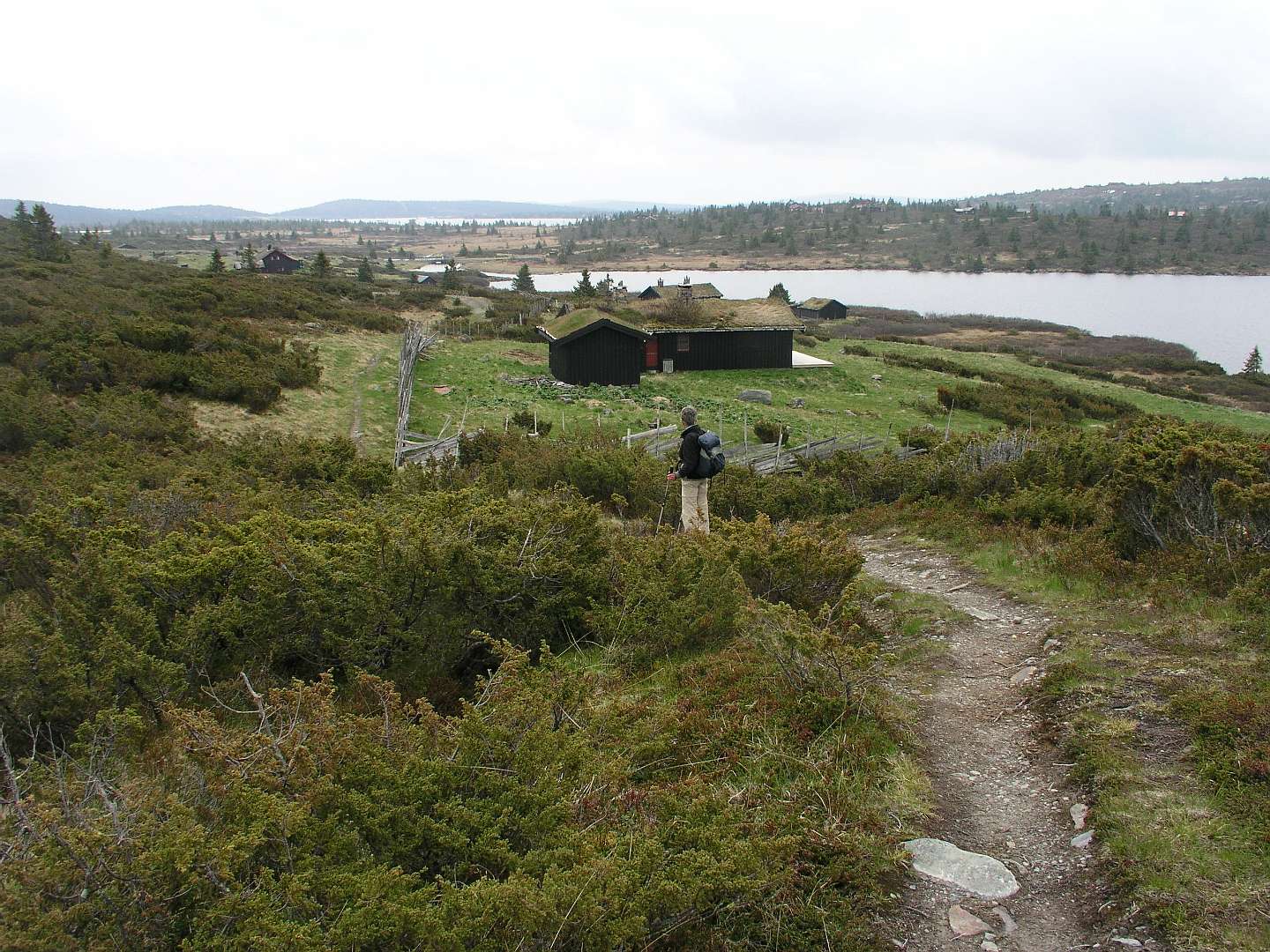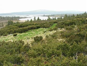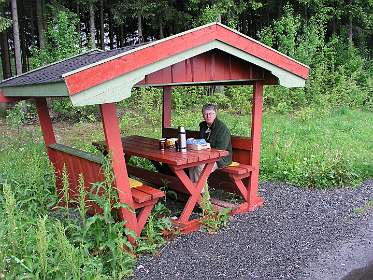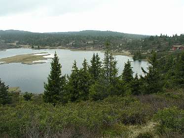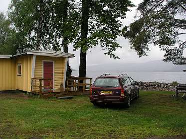 De veerboot bracht ons de volgende morgen in ruim 3 uur naar Kristiansand in Zuid Noorwegen. In de stromende regen reden we via de de N41 ('Telemarks vegen') naar Birkeland waar we Noorse kronen uit de muur haalden. We vervolgden daarna de N41 tot we een camping vonden aan een meer in de buurt van Berli. Voor 260 kronen huurden we daar een hutje (foto 5) voor de nacht. De volgende morgen reden we via de N41 en de E134 naar Heddal, waar we de grootste stafkerk van Noorwegen bezochten. Bij Hokksund verlieten we de E134 en reden we naar het Tyrifjorden meer waar we op een picknick plaats de lunch gebruikten. Vervolgens reden we door naar Lillehammer waar we in het noorden van de stad op een camping voor 2 nachten een hut huurden. Op 15 juni reden we naar Nortseter, 10 km ten westen van Lillehammer. Wij waren daar al eens eerder geweest in de winter om er te langlaufen. In datzelfde gebied liepen we nu wandeling 1 uit de ANWB 'Wandelgids Noorwegen'. De wandeling is een echte 'fjell wandeling' rond het Reinsvatnet meer. Omdat het veel geregend had was het terrein erg moerassig en op de top van de Nevelfjellet was het zo koud dat de mutsen op gingen en de handschoenen aangetrokken werden. In het totaal hadden wij zes uur nodig om de 16 km af te leggen.
