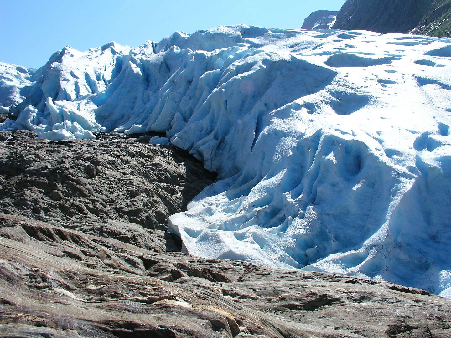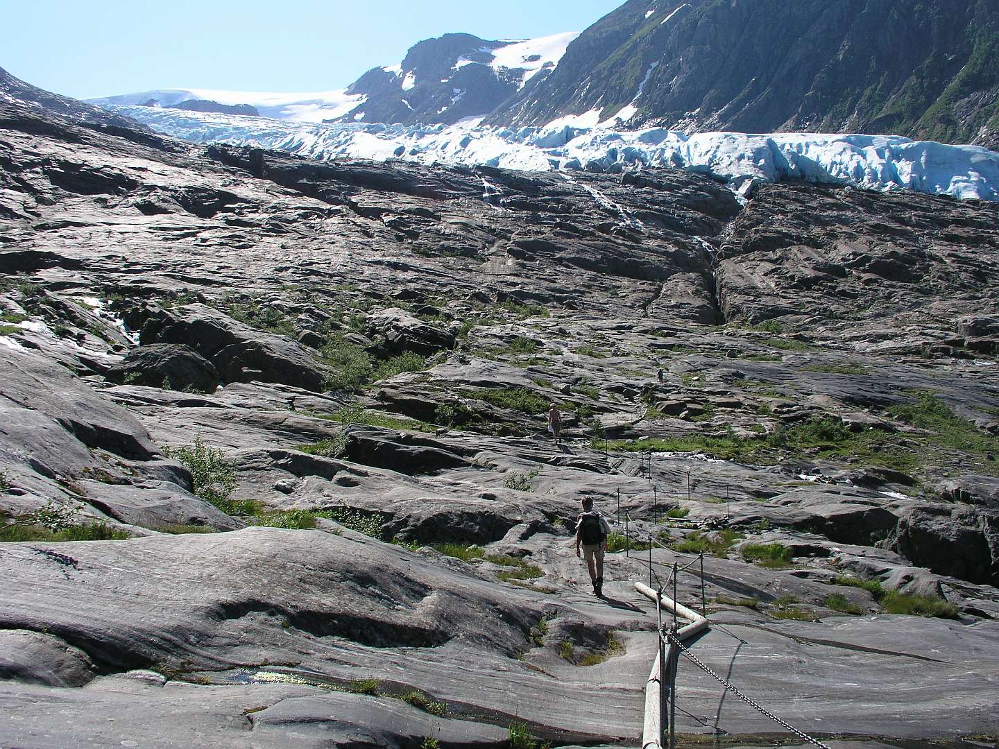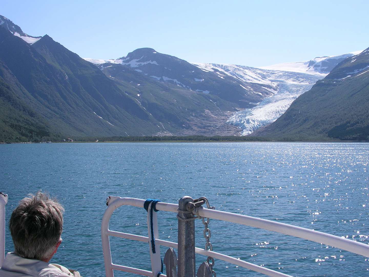 Op 6 juli namen we bijj Saltstraumen de Rv 17, een toeristische kustweg die loopt tot Steinkjer in het zuiden. Het is een zeer rustige weg met een aantal veren en het loopt door een gebied met schitterende uitzichten. De eerste trekpleister langs die weg was de Svartisen gletsjer, de qua grootte tweede gletcher van Noorwegen. Met een bootje vaarden we het fjord over van Holand naar Svartisen. Daar liepen we 3 km naar de voet van de gletsjer en klauterden over de rotsen om bij het ijs te kunnen komen.