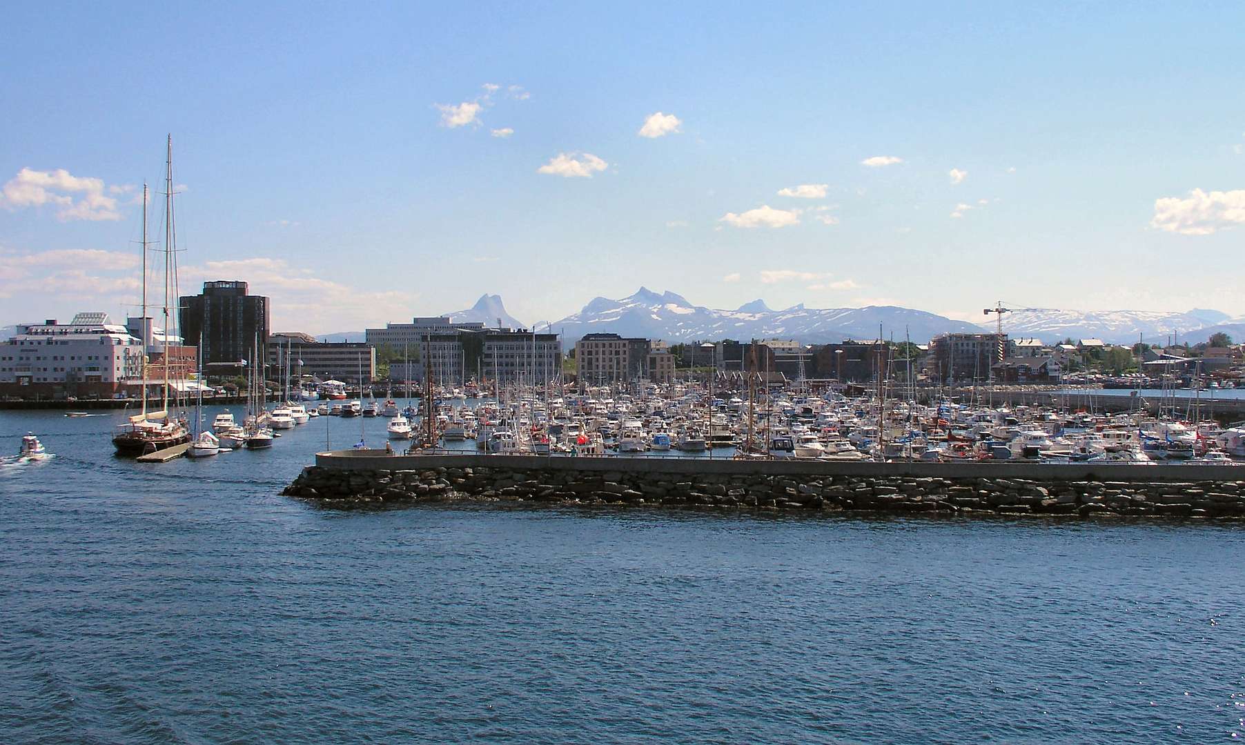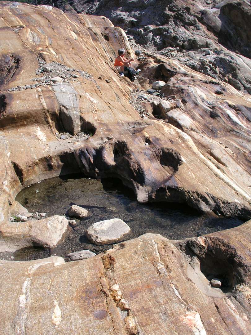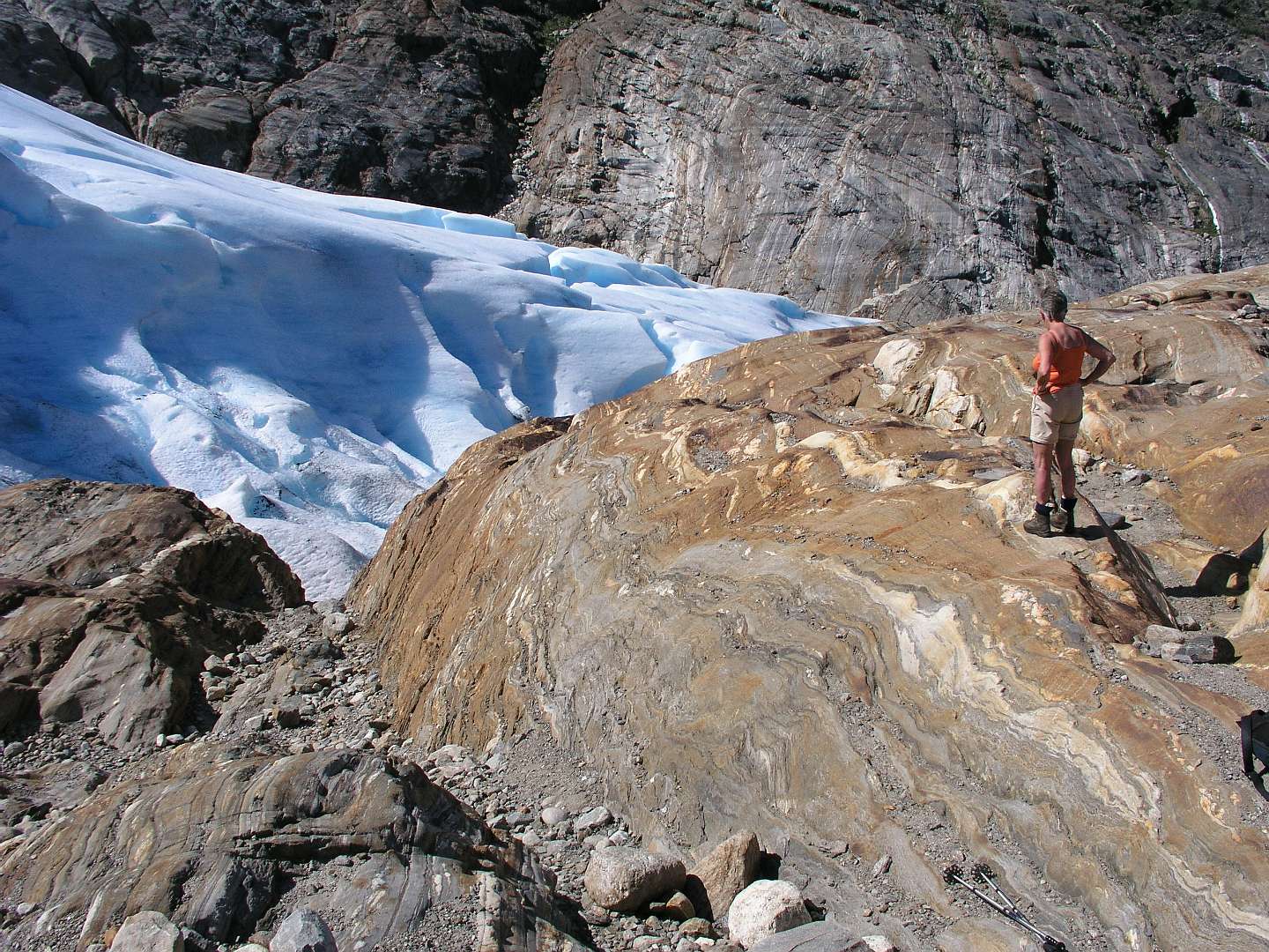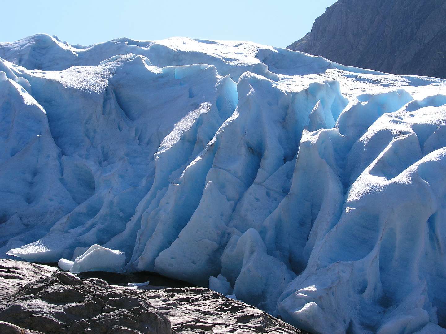 Op 6 juli namen we bijj Saltstraumen de Rv 17, een toeristische kustweg die loopt tot Steinkjer in het zuiden. Het is een zeer rustige weg met een aantal veren en het loopt door een gebied met schitterende uitzichten. De eerste trekpleister langs die weg was de Svartisen gletsjer, de qua grootte tweede gletcher van Noorwegen. Met een bootje vaarden we het fjord over van Holand naar Svartisen. Daar liepen we 3 km naar de voet van de gletsjer en klauterden over de rotsen om bij het ijs te kunnen komen.