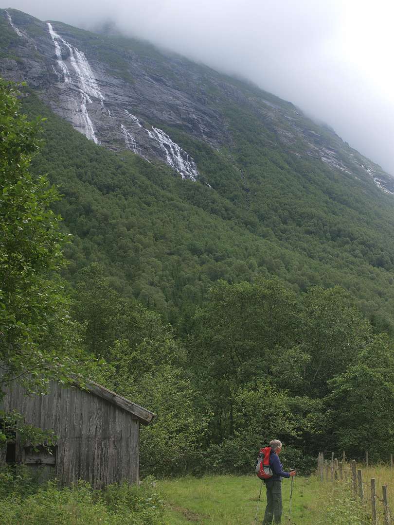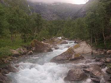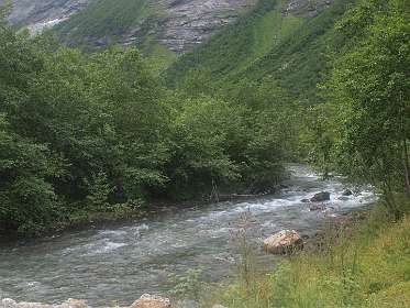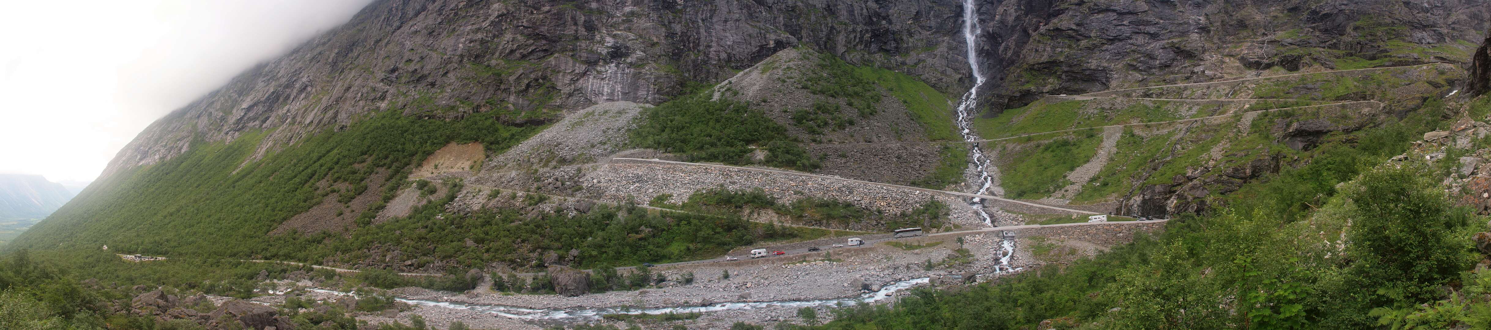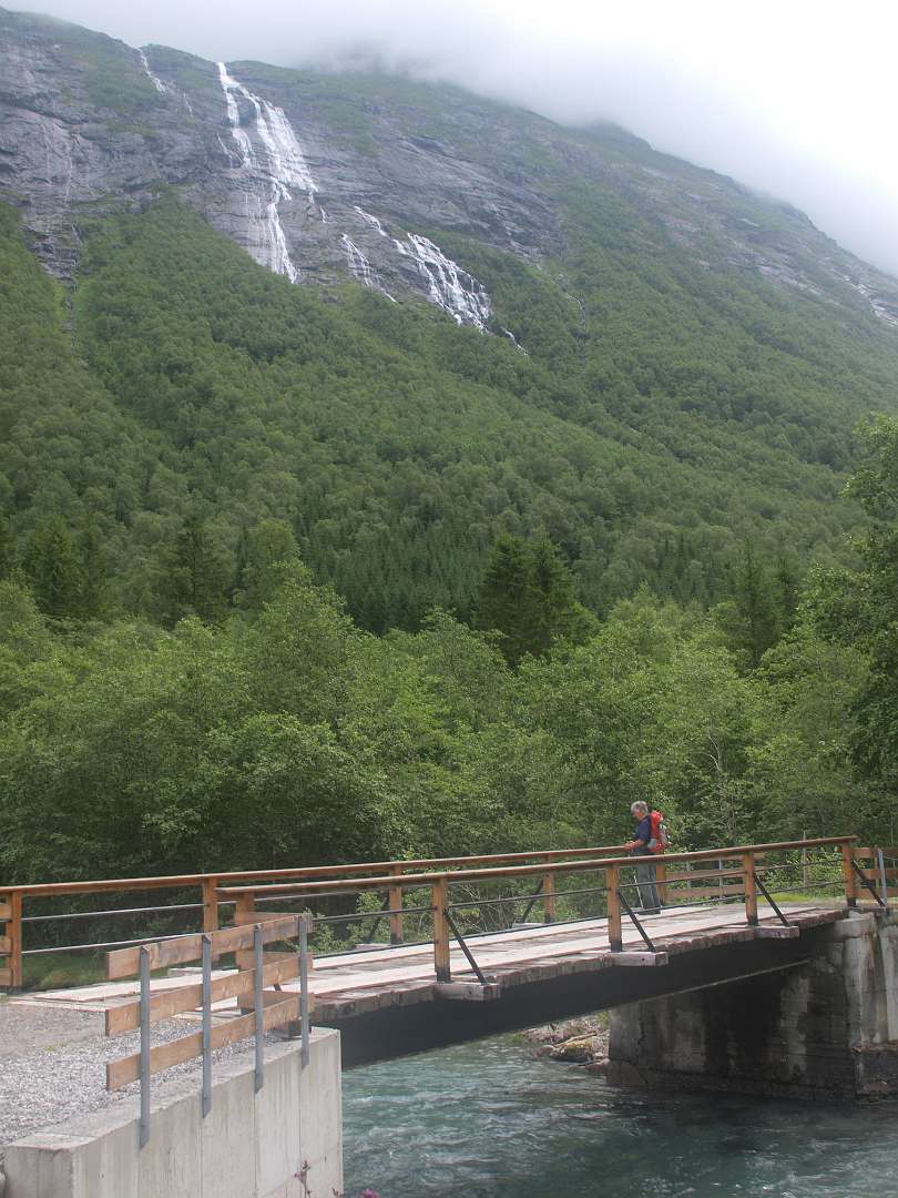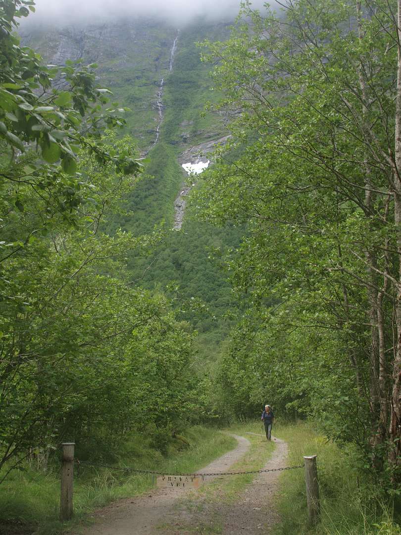 In Andalsnes, gaat weg 63, de Trollstigen weg, eerst door het dal en daarna via een pas met heel veel haarspelbochten naar 700 m hoogte. Voordat die weg er was liep er lastdieren pad door dat dal omhoog, het Klovestien pad, dat al in 1766 bestond. Wij liepen een deel van dit pad vanaf de Trollstigen camping. Het loopt ten oosten van de weg en de rivier. Er zijn 4 plaatsen waar U van de weg het pad op kan (S1-S4 of de tracklog). Het is een rondwandeling van 14km (terug via de weg).