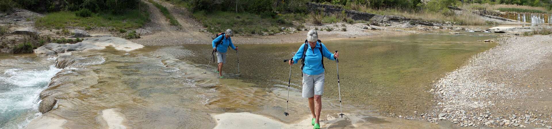 De eerste rondwandeling (7,7 km blauwe track) gaat naar Ligüerre de Cinca. Dit is een oud dorp dat helemaal gerestaureerd is en nu bestaat uit hotels en appartementen voor de toeristen. Voor de tweede rondwandeling moet je waterschoenen meenemen: we gaan door de Rio Susia die bij de camping in het meer komt. We volgden de Rio Susia 3 km en keerden toen weer terug (rode track).