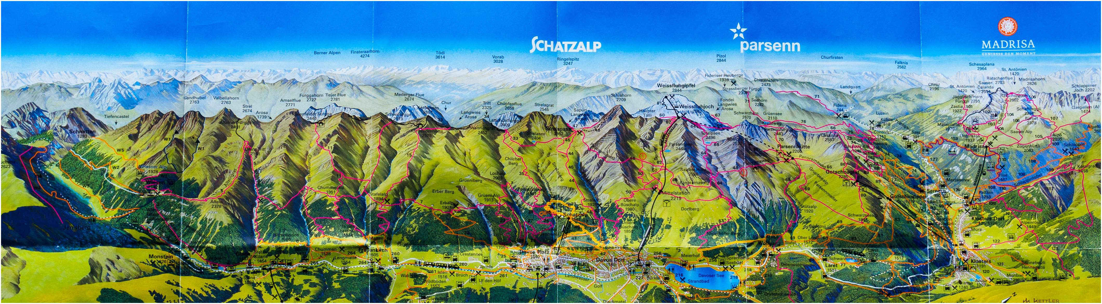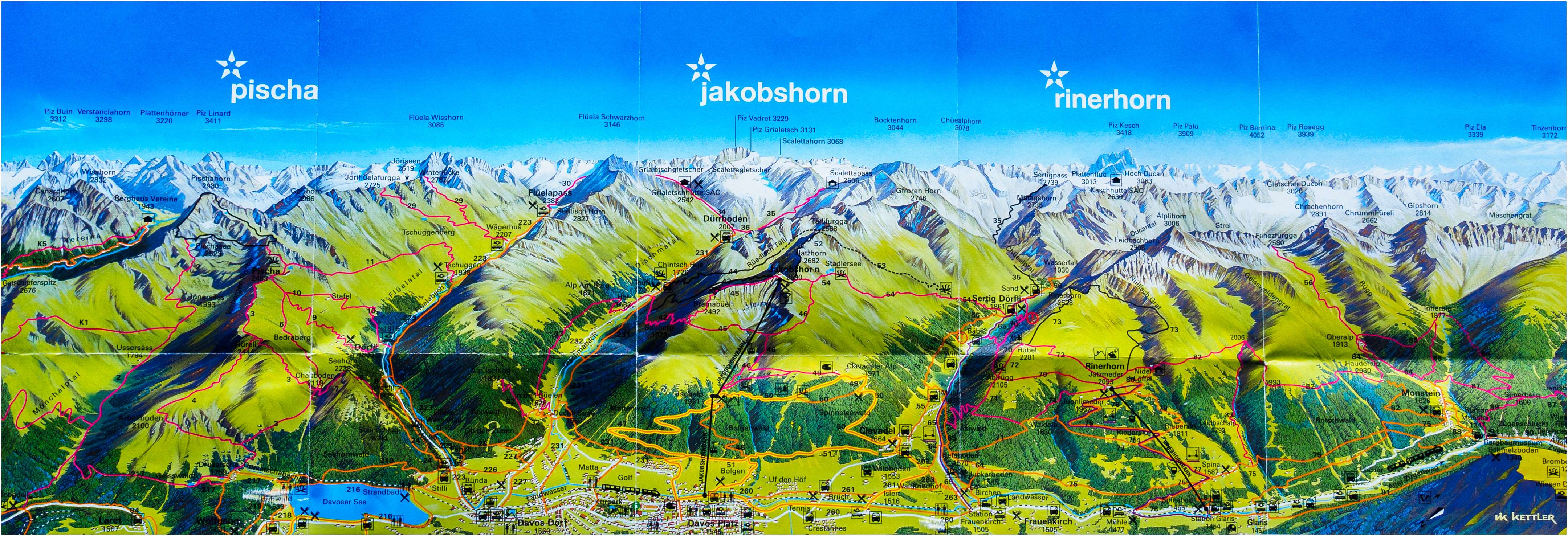 We begonnen onze wandelingen in juni 2018 in Davos. We stonden op de RinerLodge camping in Glaris, 7 km van Davos. Dat is een prima locatie voor wandelingen, want met de gratis DAVOS KLOSTERS gastenkaart kun je gratis gebruik maken van alle liften, bussen en treinen in dit gebied. De trein stopt voor de camping en je kunt bij de camping mat de Rinerhorn lift omhoog.