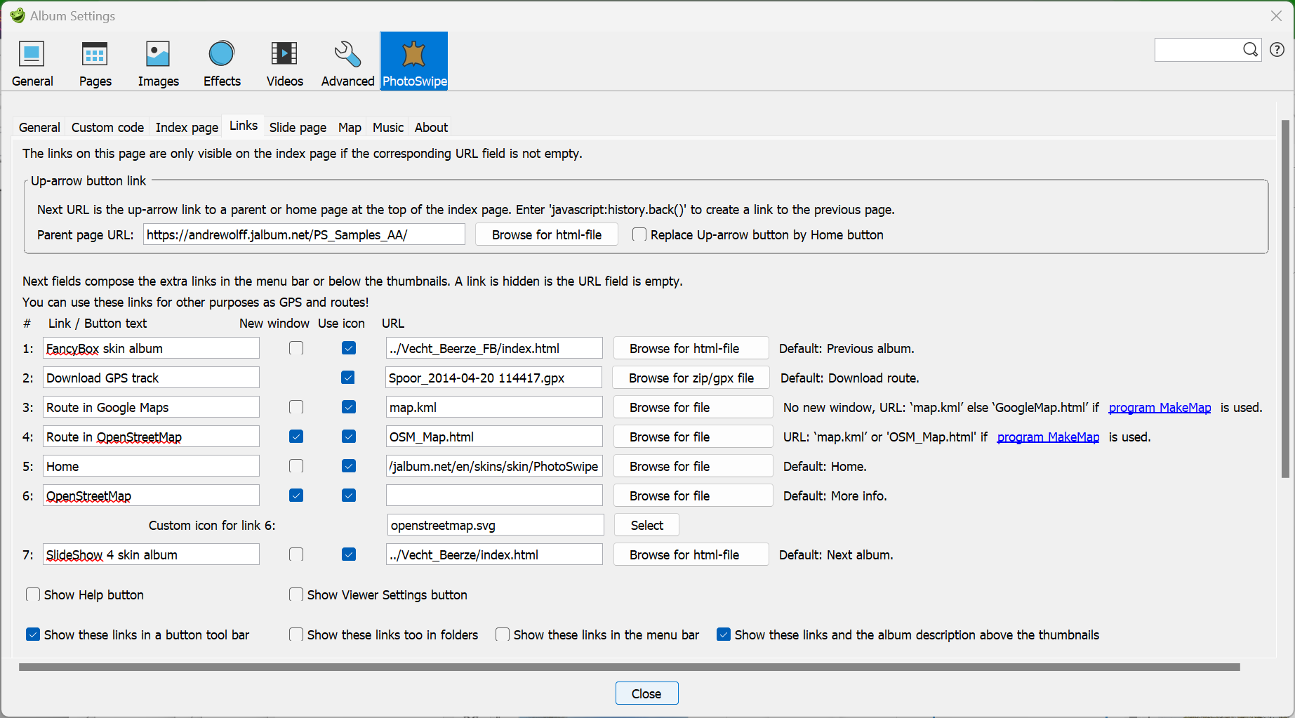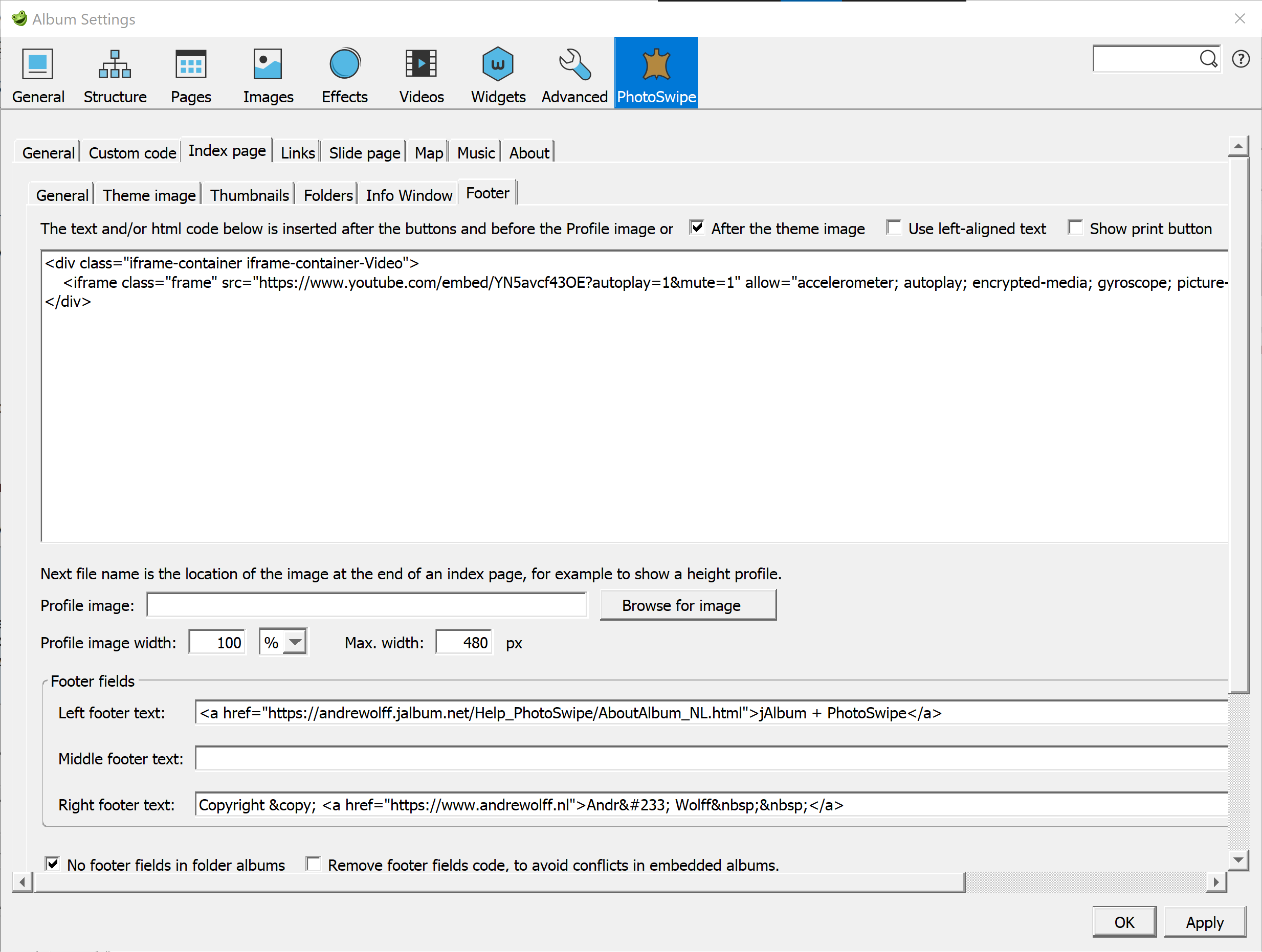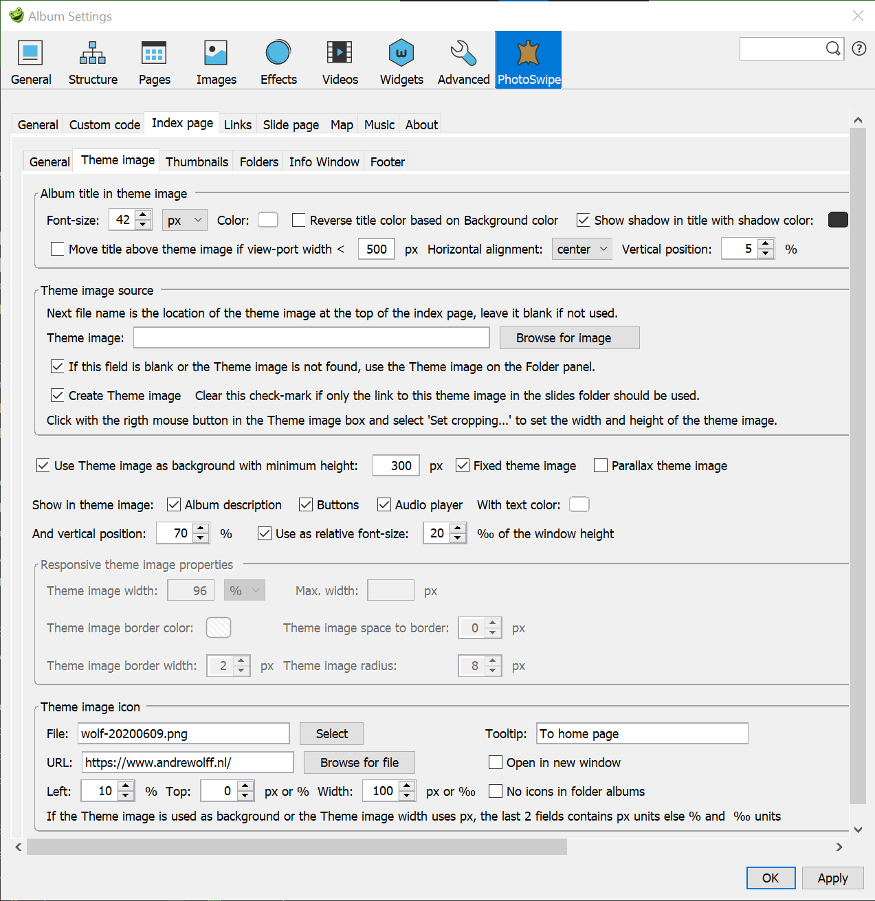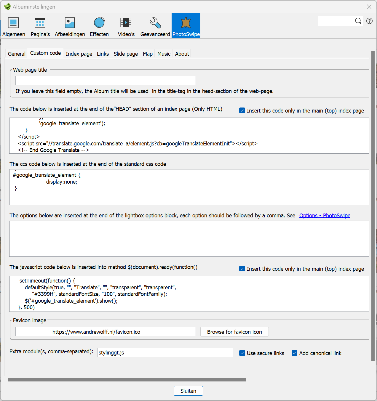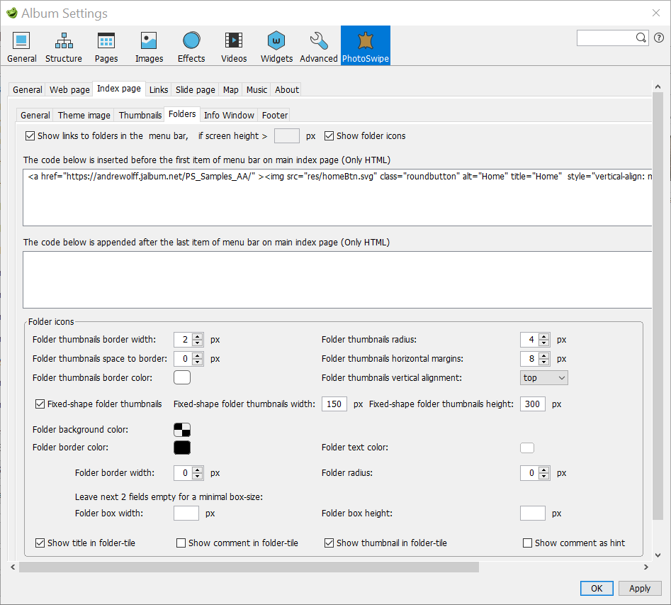 into the HEAD section of your main album which is used for large screens. Javascript variable absolutePath is in version 3.5.1 inserted in the top of the <head> section. It gives the URL of the (folder-) album. You can do this by inserting this code in the 2nd text box on the Skin settings – Custom code.