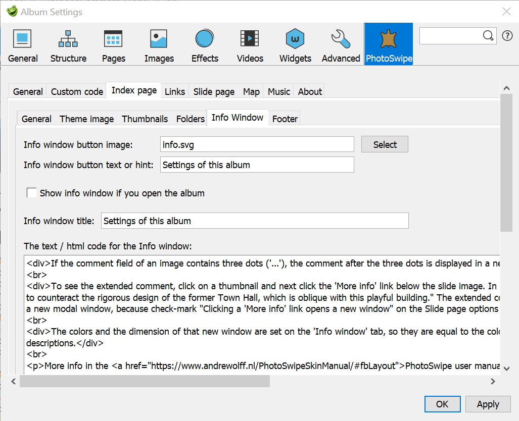 This user manual gives the required information to create albums with the PhotoSwipe skin. It is not a manual for the viewers of the albums, the user interface of PhotoSwipe albums has been described in a help file for the PC and in another help file for a mobile device.