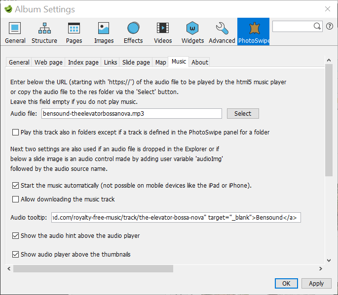The Album title will be displayed as Title on the index page. After a change of the pictures path, click first the OK button and change next the Album Title and or the Album description otherwise these data are lost.