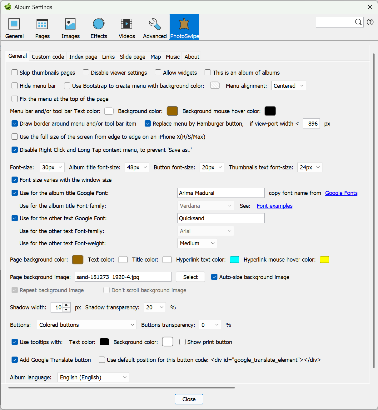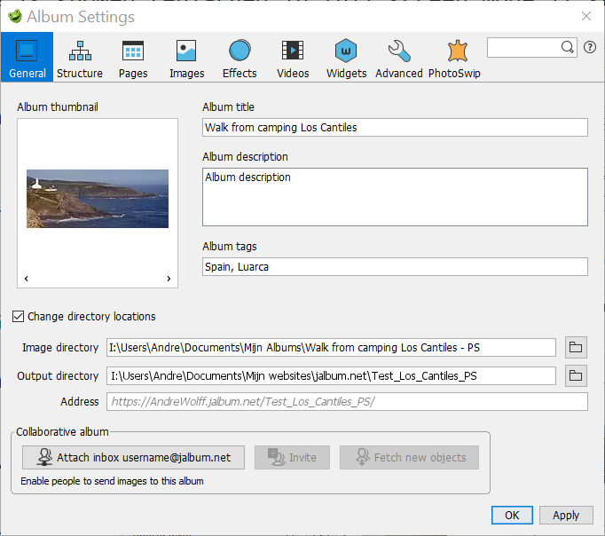 The Album Settings – Advanced - General panel, is important if you display pictures in subdirectories. In that case you should read my note: How to process pictures in subdirectories in jAlbum with the PhotoSwipe skin.
