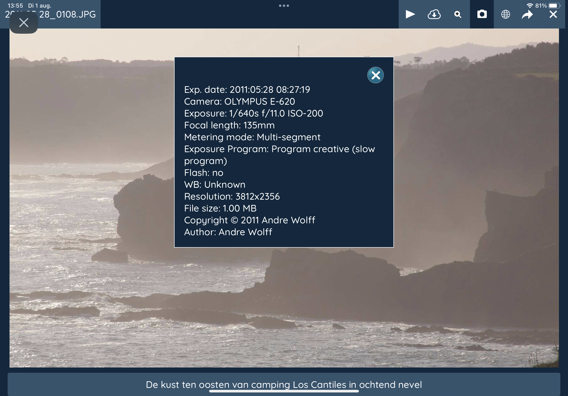 If you click the Show Exif data button or the E-key on a PC the camera data are displayed above the slide in a modal window: