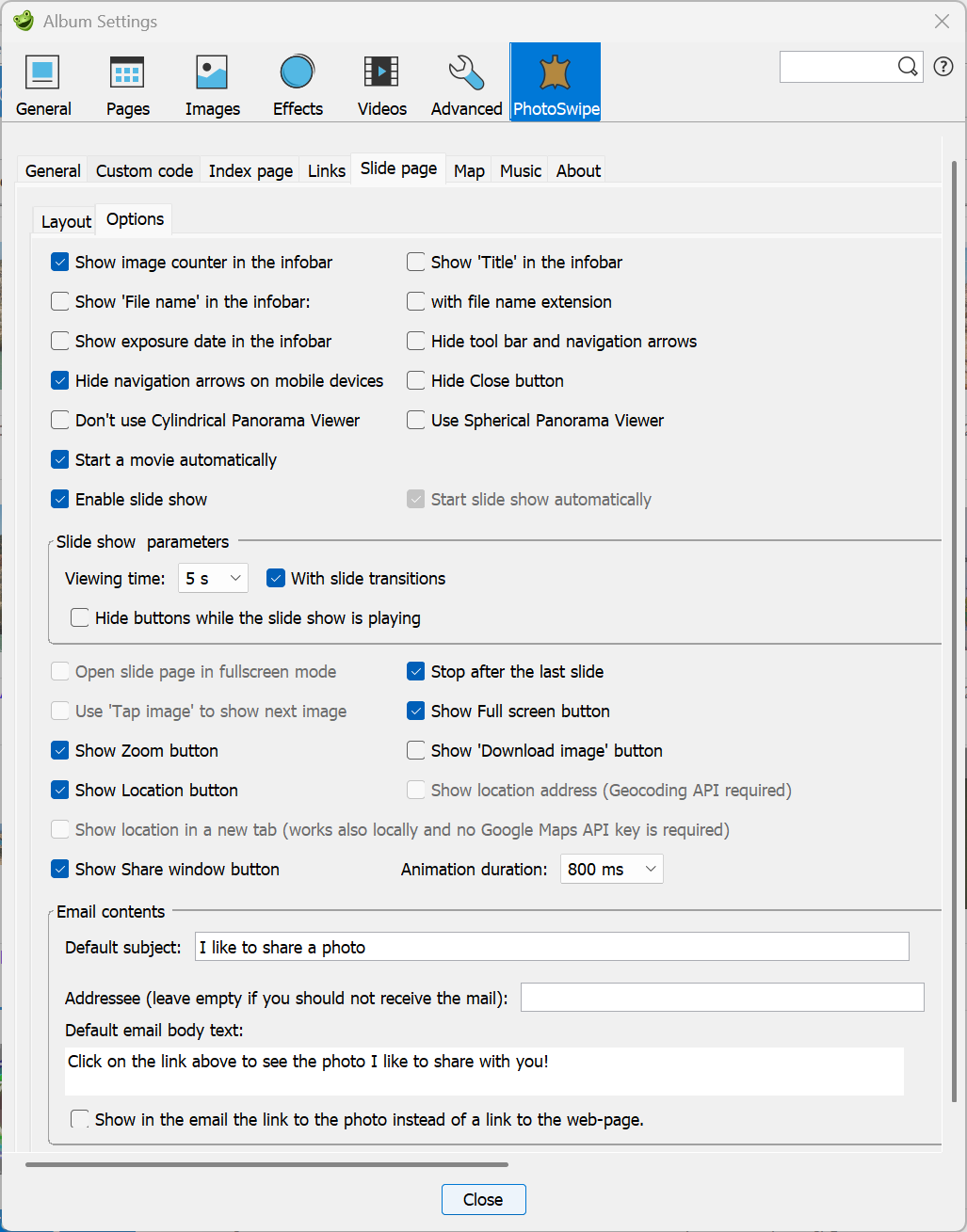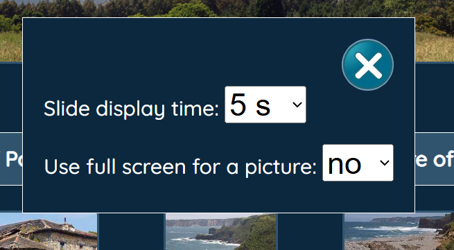 The PhotoSwipe skin has an optional slide show function. The viewer has full control over the slide show via the settings button in the upper right corner of the index page. If you click that button a window opens where you can change the viewing time per slide. You an choose there too to use full-screen for the slide page if it has been supported by the used device.