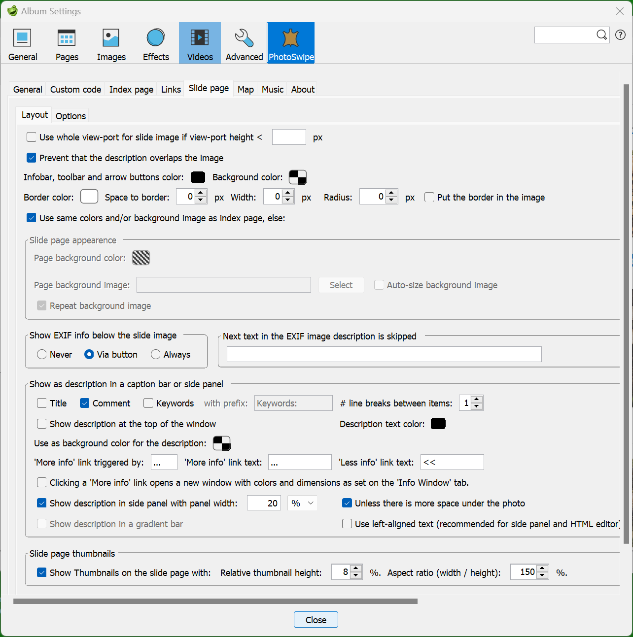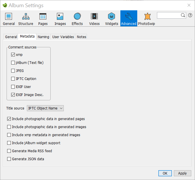 You should select here check-marks 'EXIF Image Desc.' and 'Include photographic data in generated pages' to add descriptions to slides and GPS data to identify the location of the picture. In jAlbum version 14 it is also required to set the xmp check-mark, otherwise special characters like é and © are not correctly displayed.