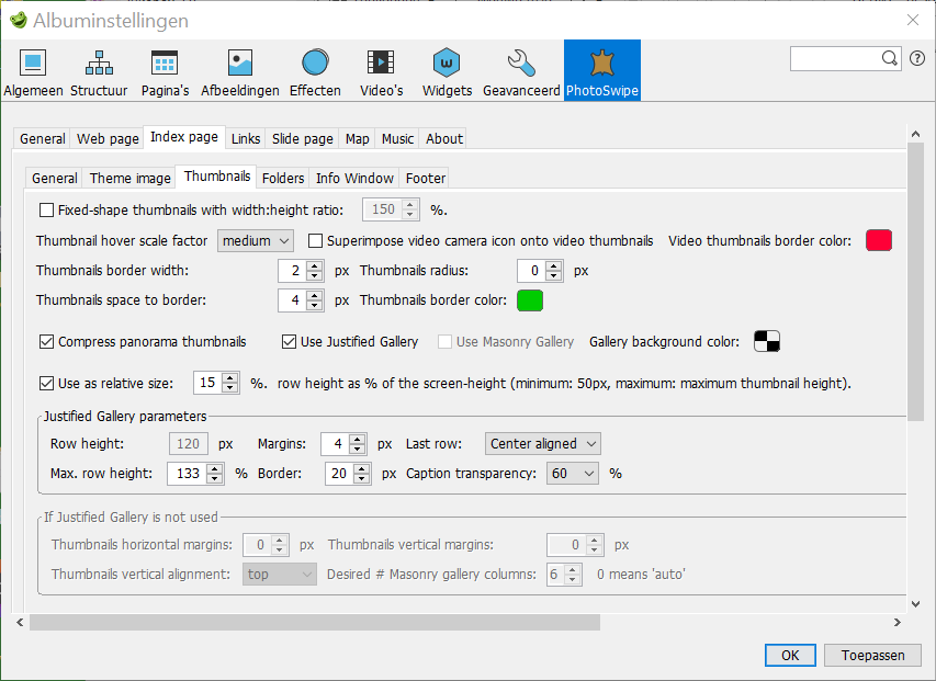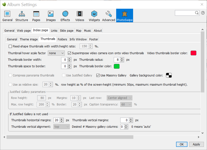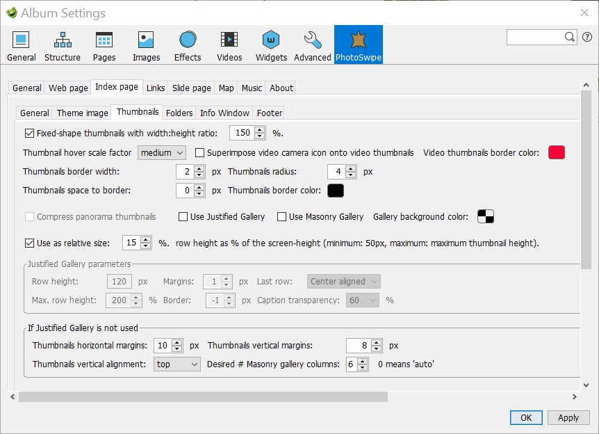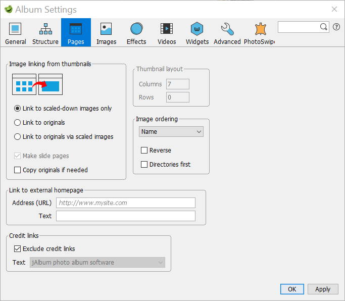 The layout and appearance of an album is tuned by the album creator in the jAlbum program via the Album / Settings menu: