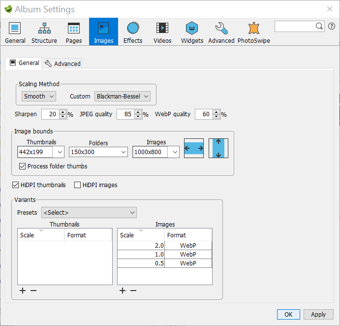 You see in the screen-shot of the jAlbum Images General tab above 4 variants selected, by selecting in the combo-box 'Faster and best quality'.